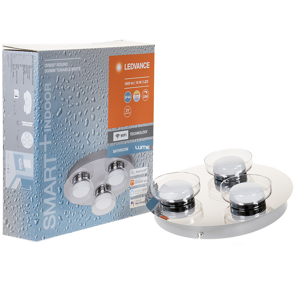Lampa LED inteligentă Ledvance Smart+ WIFI pentru tavan (Orbis Wall Round) oferă iluminat eficient din punct de vedere energetic pentru încăperi, cu o putere de 18 W și un flux luminos de 1800 lumeni. Sursa de lumină a corpului de iluminat este un modul LED încorporat cu o temperatură de culoare care poate fi reglată între 3000 și 6500 Kelvin, permițând atât lumină albă rece, cât și caldă. Este controlată prin intermediul unei aplicații și este compatibilă cu sistemele Google Assistant și Amazon Alexa. Luminozitatea lămpii este reglabilă, iar clasa de protecție IP44 înseamnă că este protejată împotriva stropirii cu apă, în timp ce rezistența la impact a fost clasificată IK03. Lampa de tavan de culoare cromată, cu un diametru de 300 mm și o înălțime de 78 mm, are o durată de viață lungă de 30.000 de ore și o putere luminoasă de 60 lm/W. Produsul cântărește 1,32 kg și are dimensiuni de ambalare de 36x36x9 cm. Corpul lămpii este fabricat de Ledvance.