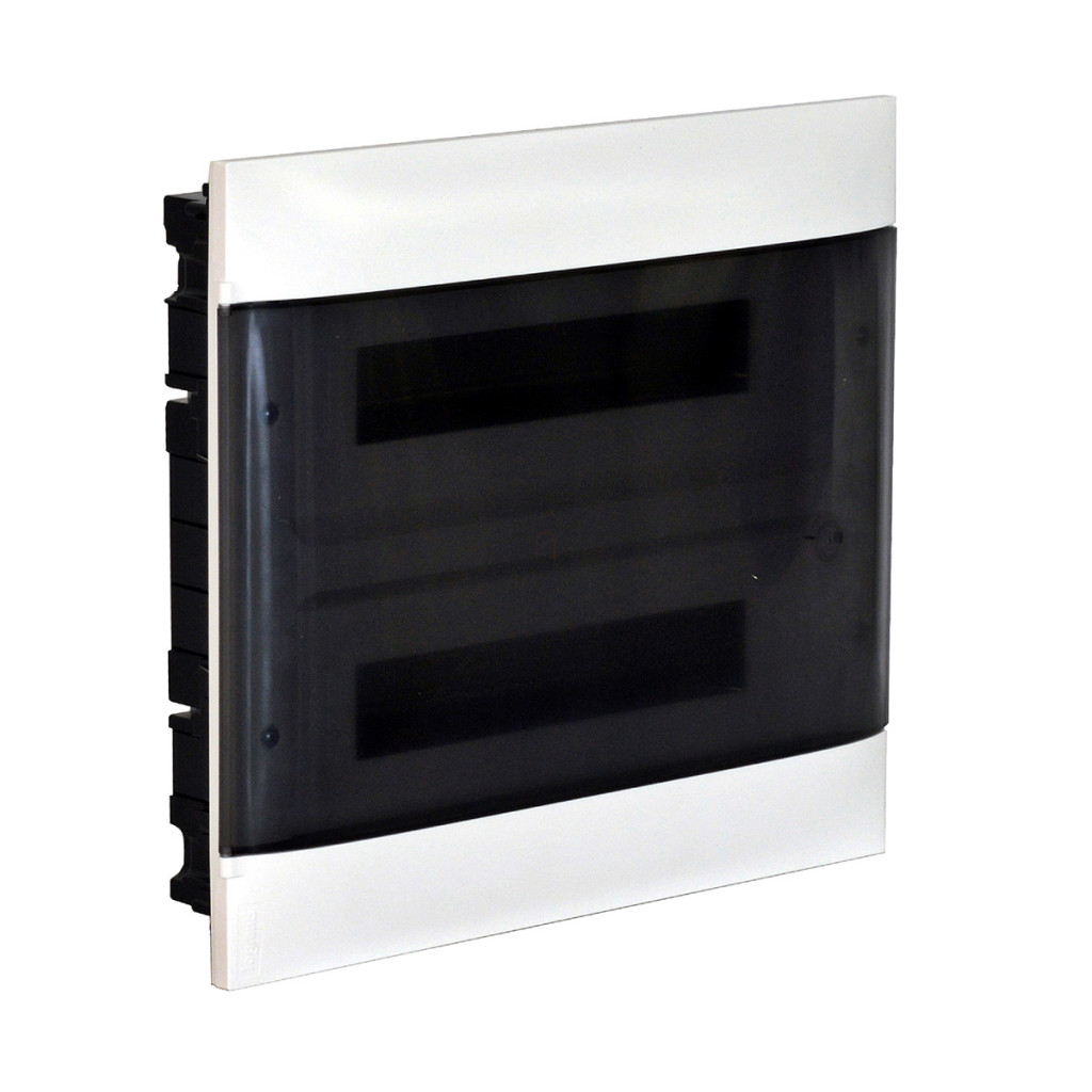 Legrand 135172 PractiboxS cutie de distribuție încastrată pentru gips-carton, 2 rânduri, 12 module, cu ușă transparentă de culoare fumurie, împământare de protecție și terminal neutru