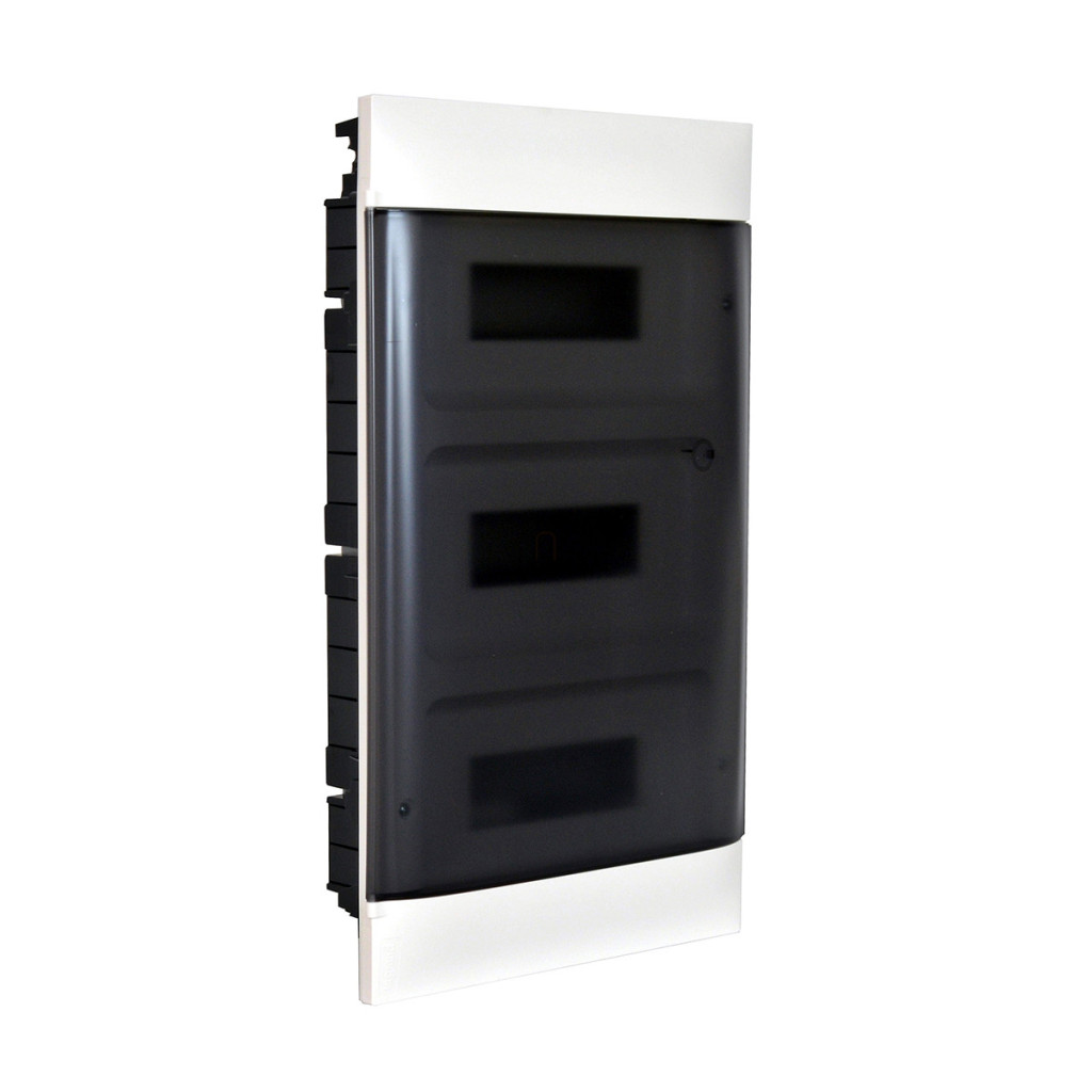 Legrand 135173 PractiboxS cutie de distribuție încastrată pentru gips-carton, 3 rânduri, 12 module, cu ușă transparentă de culoare fumurie, împământare de protecție și terminal neutru