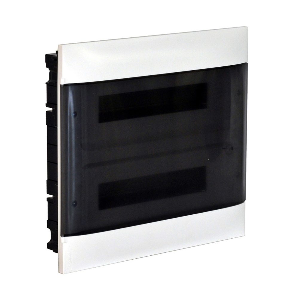 Legrand 135152 PractiboxS cutie de distribuție mică pentru montare încastrată în pereți din cărămidă, 2 rânduri, 12 module, cu ușă transparentă de culoare fumurie, împământare de protecție și terminal de distribuție neutru