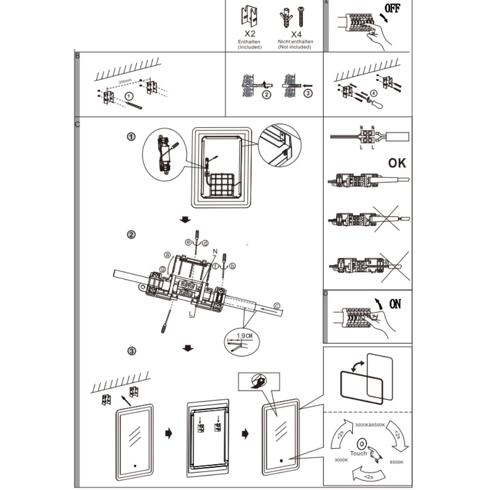 Descoperă o nouă lumină în baia ta cu această oglindă cu iluminare LED reglabilă, care încântă spațiul cu lumină albă rece și caldă! Această oglindă cu iluminare LED nu este doar practică, ci și un plus elegant pentru baia ta. Materialele din aluminiu și sticlă emană eleganță, în timp ce lumina albă reglabilă (3000/4000/6500 K) vă permite să reglați iluminatul în funcție de starea dvs. de spirit. Modulul LED de 20 W oferă o putere luminoasă de 1700 lumeni, astfel încât să puteți vedea perfect fiecare detaliu. Este ușor de instalat, astfel încât să vă puteți bucura rapid de iluminatul modern. Datorită protecției IP44, poate fi utilizat în siguranță în încăperi umede, transformând baia dvs. într-o adevărată cutie de bijuterii.
