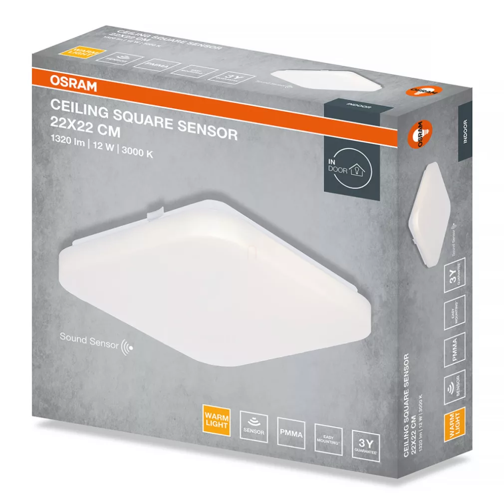 Osram Ceiling Square Sensor lampă LED de tavan cu senzor de sunet și lumină, 22x22 cm, 12 W, 3000 K, 960 lm, alb mat