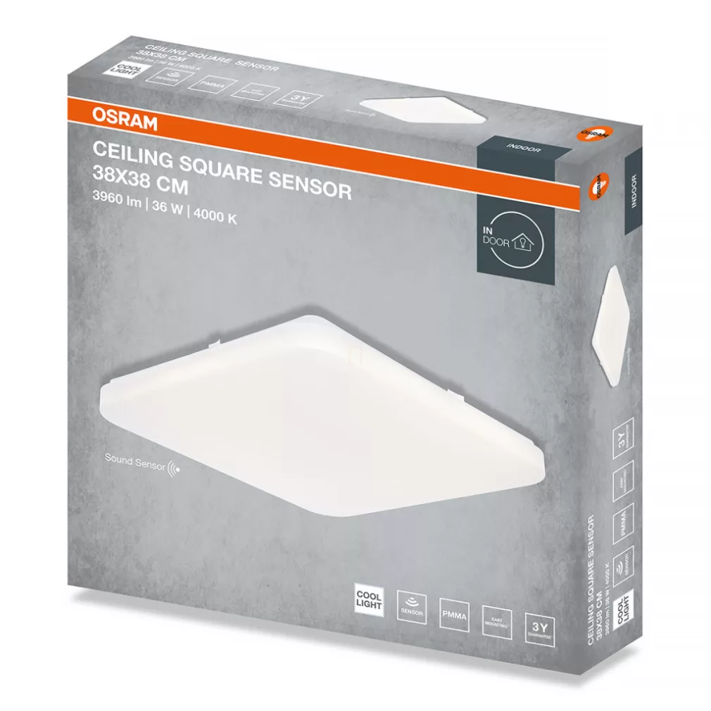 Osram Ceiling Square Sensor lampă LED de tavan cu senzor de sunet și lumină, 38x38 cm, 36 W, 4000 K, 2880 lm, alb mat