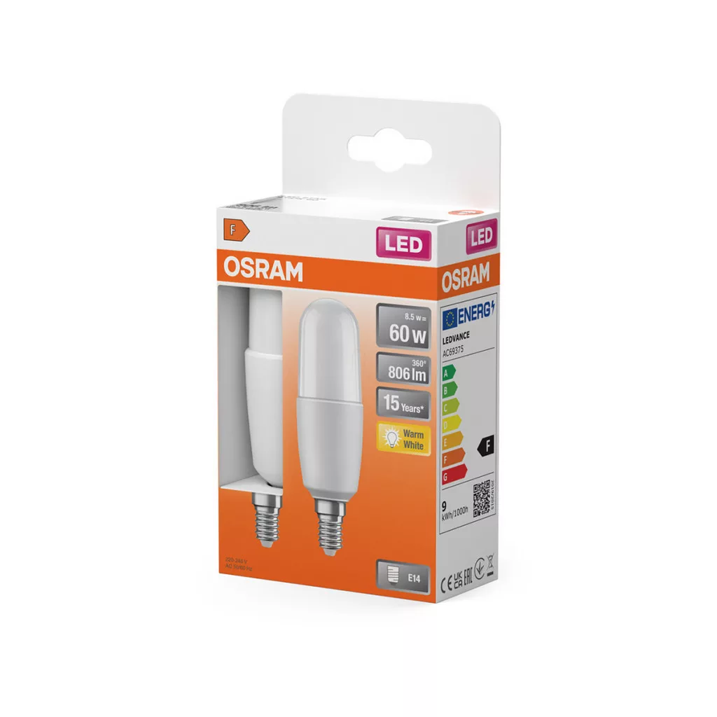 Osram E14 LED PCR Classic Stick 827 8,5 W, 806 lm, 2700 K, opal
