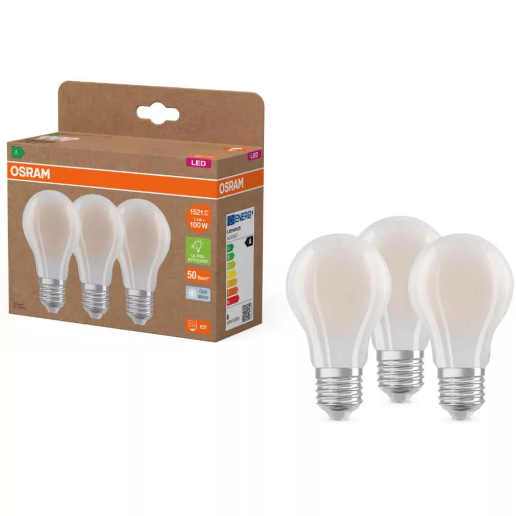 Osram E27 LED 7,2 W, 1521 lm, 4000 K, alb rece, sticlă opală - înlocuiește un bec standard de 100 W, 3 bucăți - Superstar+ Classic A