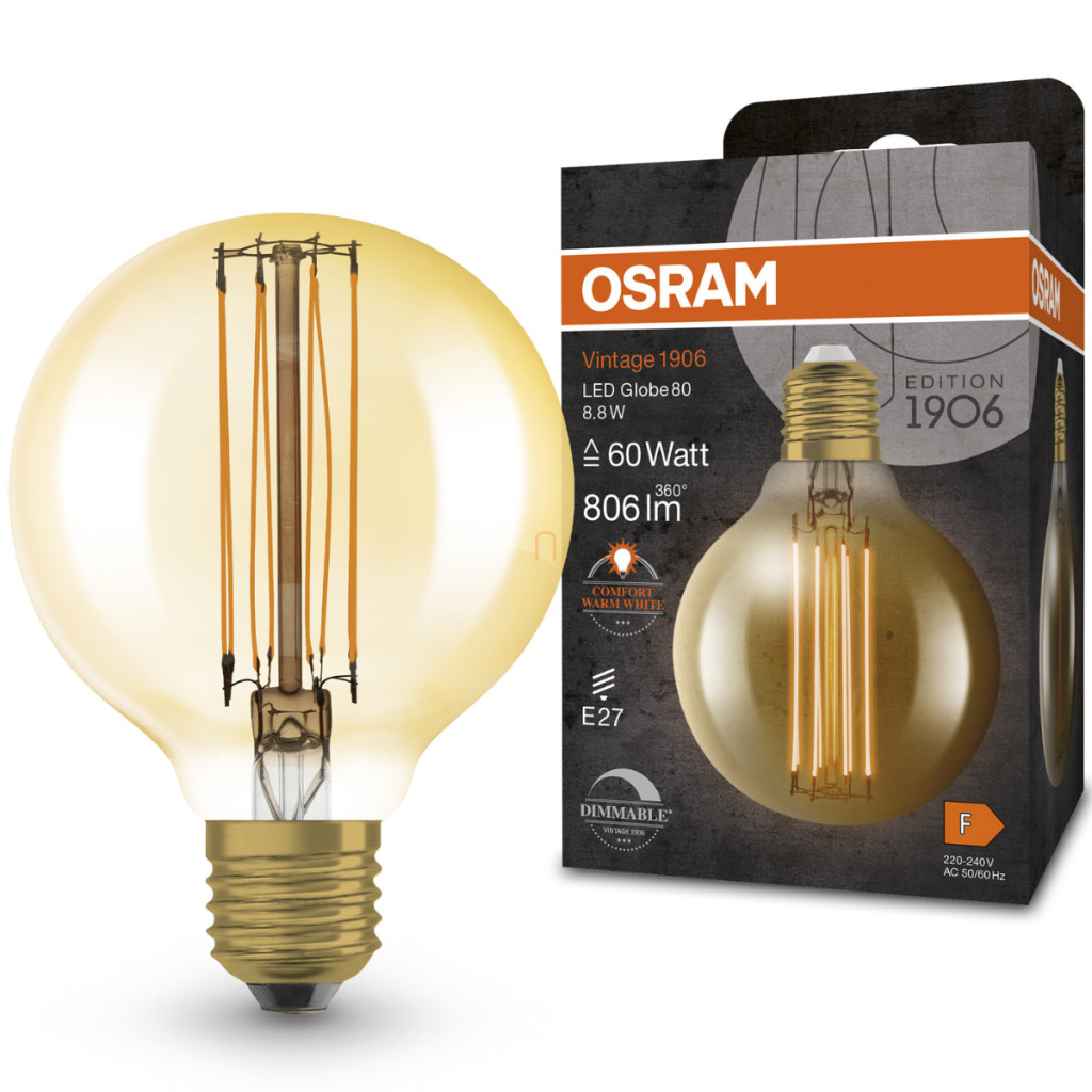 Osram E27 LED 8,8 W, 806 lm, 2200 K, lumină de lumânare, intensitate reglabilă, sticlă aurie - înlocuiește becul de 60 W - Vintage 1906 DIM Classic Globe Gold filament