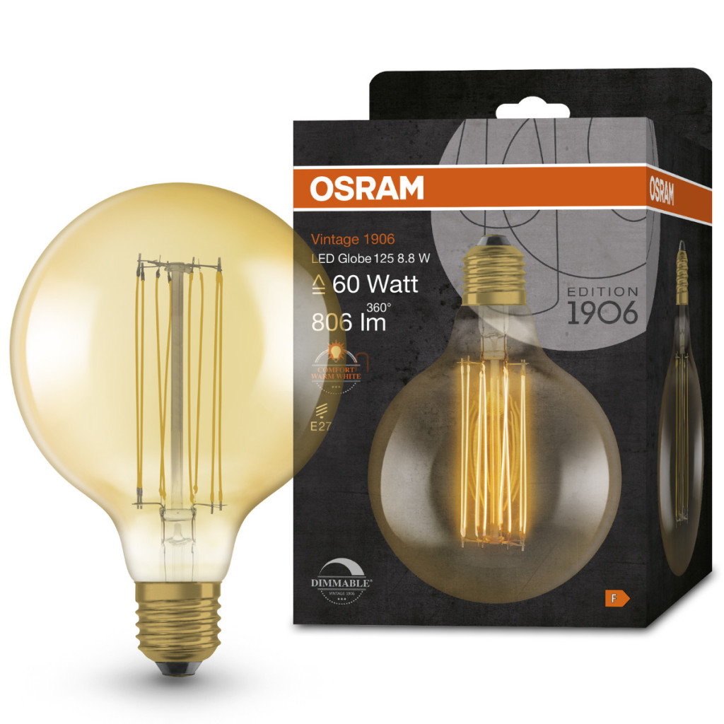 Osram E27 LED 8,8 W, 806 lm, 2200 K, lumină de lumânare, intensitate reglabilă, sticlă aurie - înlocuiește becul de 60 W - Vintage 1906 DIM Classic Globe125 Filament auriu