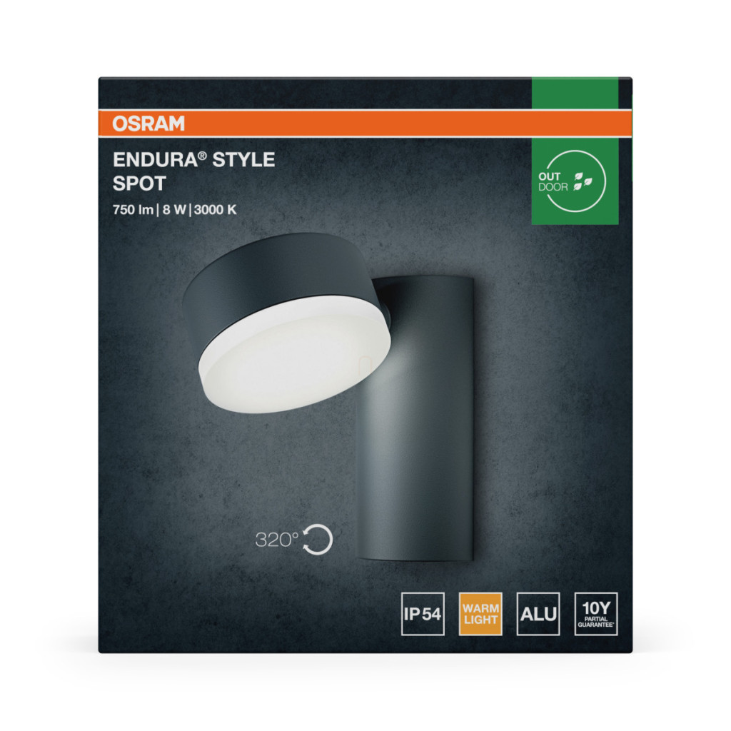 Osram Endura Style Spot Round 8W 3000K IP44, lampă LED gri pentru exterior, montată pe perete