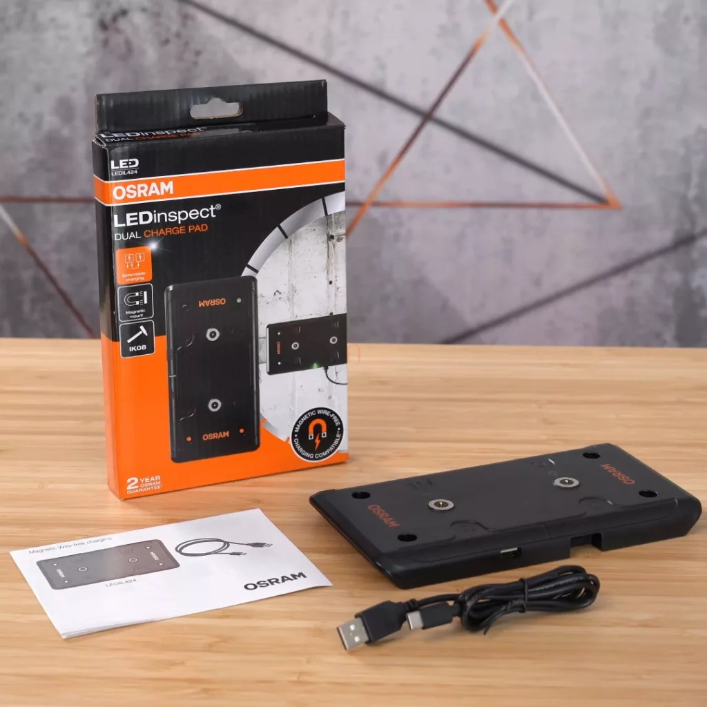 OSRAM LEDinspect DUAL CHARGE PAD este o stație de încărcare wireless modernă și practică, concepută special pentru lămpile de lucru LED fără fir Osram, pentru a se asigura că acestea sunt întotdeauna gata de utilizare. Această soluție de încărcare este alegerea ideală pentru oricine lucrează într-un mediu profesional, cum ar fi atelierele de reparații auto sau atelierele industriale, unde utilizarea rapidă, simplă și fără probleme a uneltelor este importantă. Tehnologia avansată OSRAM vă permite să încărcați una sau chiar două lămpi de lucru compatibile – cum ar fi modelele LEDIL421 sau LEDIL422 – în același timp, fără a fi nevoie să căutați sau să conectați cabluri. Pur și simplu așezați lampa pe pad și aceasta o va stoca și încărca automat în siguranță. Magneții puternici încorporați și orificiile pentru șuruburi permit fixarea ușoară pe diverse suprafețe, cum ar fi cutii de scule, bancuri de lucru sau orice suprafață metalică. Acest lucru o face extrem de flexibilă în utilizare și mereu la îndemână când aveți nevoie de ea. Datorită designului său robust, IK08 are rezistență la impact și protecție împotriva prafului IP20, asigurând că poate rezista chiar și celor mai dure condiții de atelier. Dispozitivul are, de asemenea, o ieșire USB-A, astfel încât alte dispozitive, cum ar fi smartphone-urile, pot fi încărcate de la acesta, sau chiar o altă placă de încărcare poate fi conectată la acesta, extinzând posibilitățile spațiului dvs. de lucru. Pachetul include, de asemenea, un cablu USB-C și un adaptor de rețea, astfel încât încărcarea să poată începe imediat. Este recomandat în special celor care caută o soluție de încărcare fiabilă și rapidă pentru munca lor, mai ales dacă utilizează frecvent lămpi de lucru. Cu toate acestea, nu este ideal pentru cei care nu utilizează lămpi de lucru LED OSRAM compatibile, deoarece tehnologia wireless funcționează numai cu acestea. OSRAM LEDinspect DUAL CHARGE PAD nu este doar avansat din punct de vedere tehnologic, ci și un plus estetic și atemporal pentru orice atelier sau stație de service. Uitați de inconvenientele cablurilor și păstrați-vă lămpile încărcate și gata de utilizare cu această soluție inteligentă și multifuncțională. Fidele numelui OSRAM, aceste stații de încărcare combină fiabilitatea și ușurința în utilizare pentru a sprijini eficiența muncii în orice moment.
