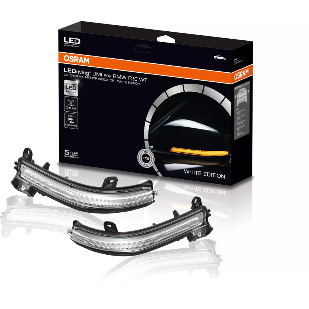 Noul Noua bandă de semnalizare LED Osram LEDDMI BMW F20WT poate fi integrată în oglindă și luminează cu o lumină dinamică bine vizibilă, oferind astfel o experiență estetică superioară față de versiunea standard. Noile lămpi LEDDMI sunt cu până la 200% mai puternice decât versiunea cu becuri tradiționale și sunt mai vizibile pentru șoferii care vin din sens opus. Lămpile sunt plug&play și pot fi înlocuite cu garanție Osram de 5 ani.