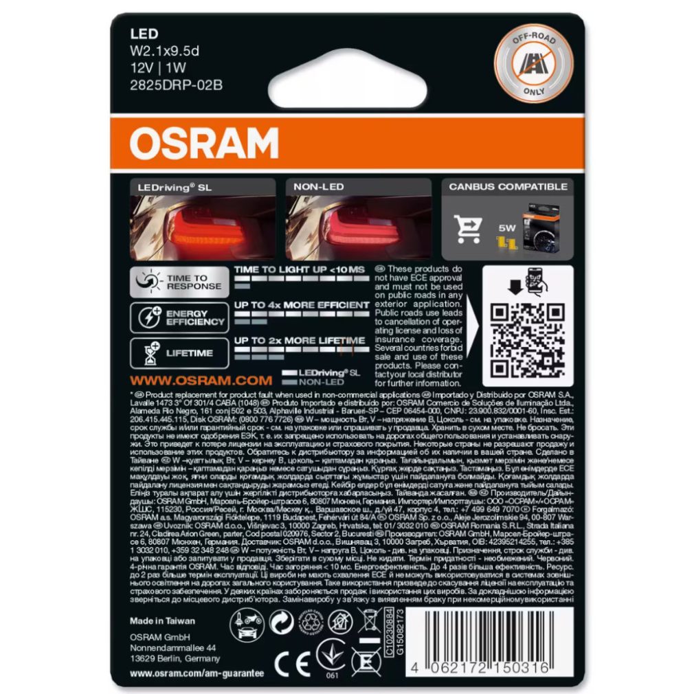 OSRAM LEDriving SL W5W, lumină roșie puternică, lampă LED pentru mașină cu consum redus de energie, soluție plug & play, 2825DRP-2BL