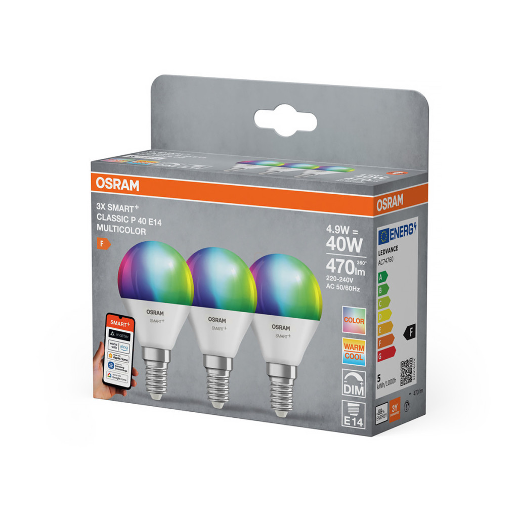 Osram Smart+ Matter Classic Multicolour E14 LED glob mic, 4,9 W, 470 lm, 2700-6500 K +RGB, cu intensitate reglabilă, 3 bucăți