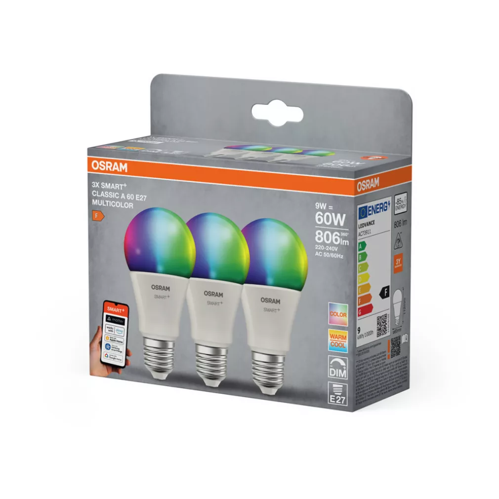 Osram Smart+ Matter Classic Multicolour E27 LED, 9 W, 806 lm, 2700-6500 K +RGB, cu intensitate reglabilă, 3 bucăți