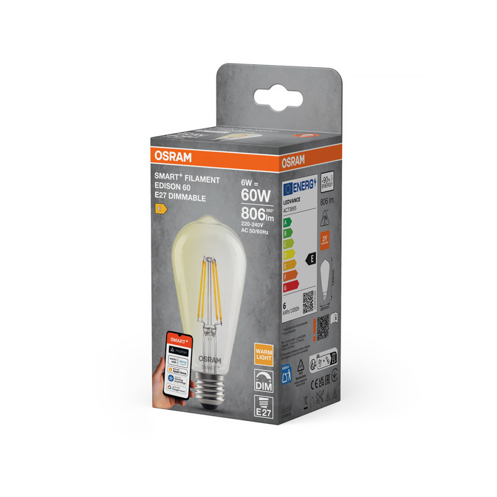 Osram Smart+ Matter Filament Classic E27 LED, 6 W, 806 lm, 2700 K, cu intensitate reglabilă
