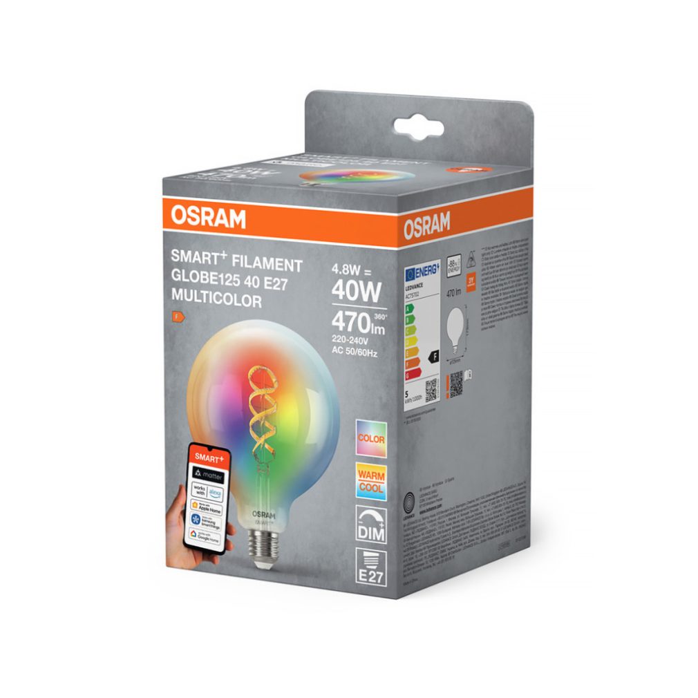 Osram Smart+ Matter Filament Classic Multicolour E27 LED, 4,8 W, 470 lm, 2700-6500 K +RGB, cu intensitate reglabilă