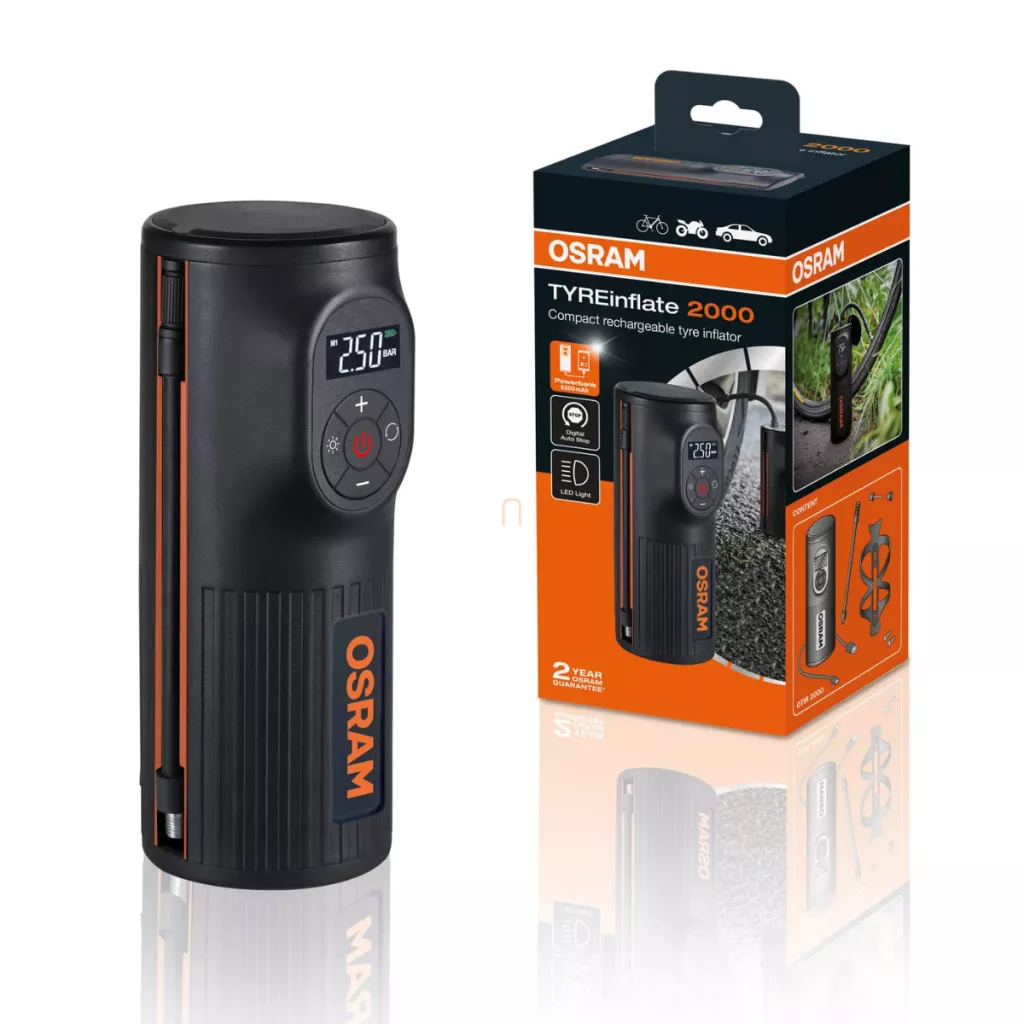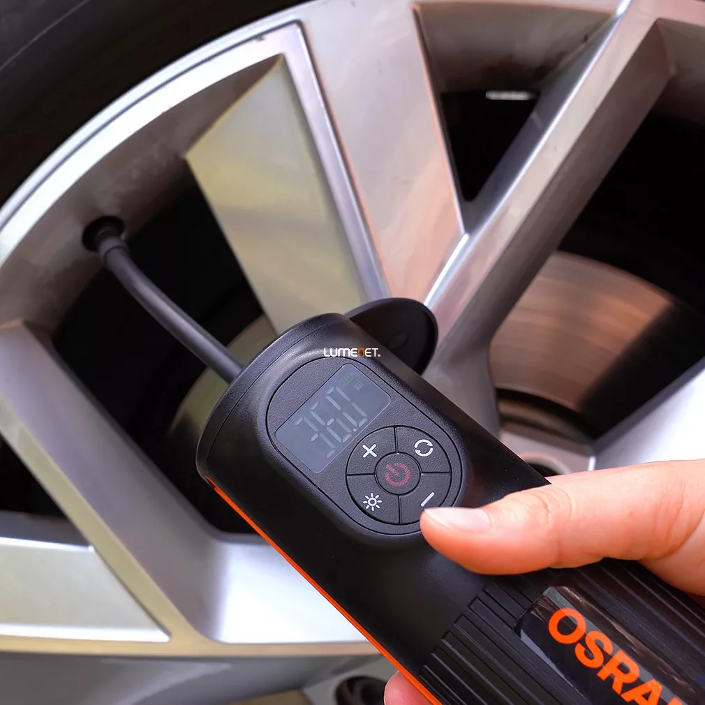 Puteți conta pe el în orice situație: Osram TYREinflate 2000 este un compresor compact și reîncărcabil pentru umflarea anvelopelor, care poate fi utilizat oriunde și oricând. Nu necesită o sursă de alimentare de 12 V, deoarece are o baterie încorporată care furnizează suficientă energie. Îl puteți utiliza pentru a umfla anvelopele mașinii, bicicletei, motocicletei sau scuterului. Afișajul său mare și ușor de citit arată valorile PSI, kPA și BAR. Presiunea maximă a dispozitivului este de 120 PSI/8,3 BAR.