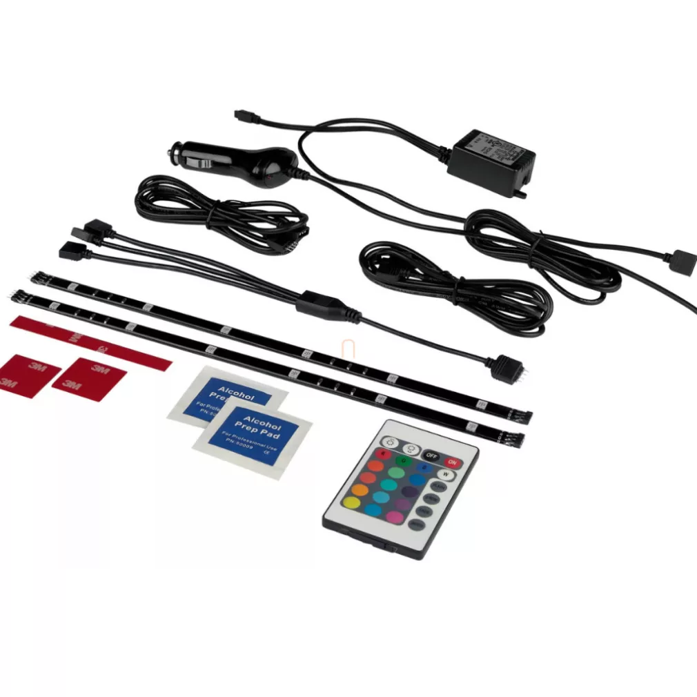 Pachetul include două benzi LED autoadezive de calitate Osram, cu lungimea de 30,5 cm, o telecomandă, două cabluri cu lungimea de 80 cm, un conector F cu două căi (splitter) și un adaptor de 12 volți pentru brichetă. Pachetul de bază LEDAmbient Tuning light este ușor de instalat și de utilizat. Cu ajutorul telecomenzii, puteți controla cu ușurință noul sistem de iluminat de la o distanță de până la 4,6 metri. Producătorul oferă o garanție de 2 ani pentru pachetul de dispozitive.
