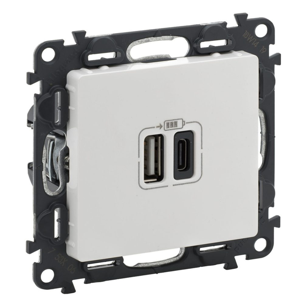 Priză de încărcare albă Valena Life cu conectori dubli USB tip C + USB tip A, 5 V–3 A–15 W, protecție la supratensiune >1 kW, SELV clasa II, 753106 Legrand