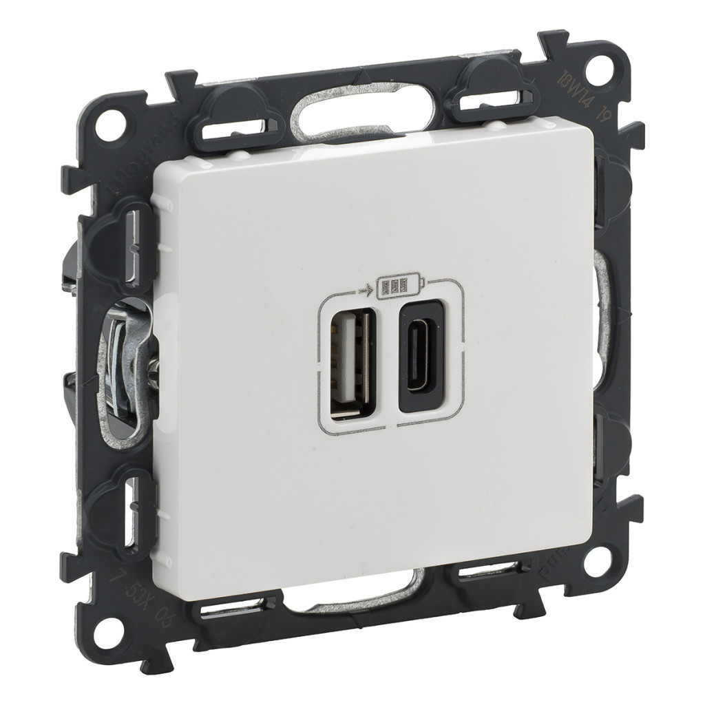 Priză de încărcare Legrand Valena Life cu conectori dubli USB tip C + USB tip A, 5 V–3 A–15 W, protecție la supratensiune <gt/>1 kW, SELV clasa II, alb - 753106