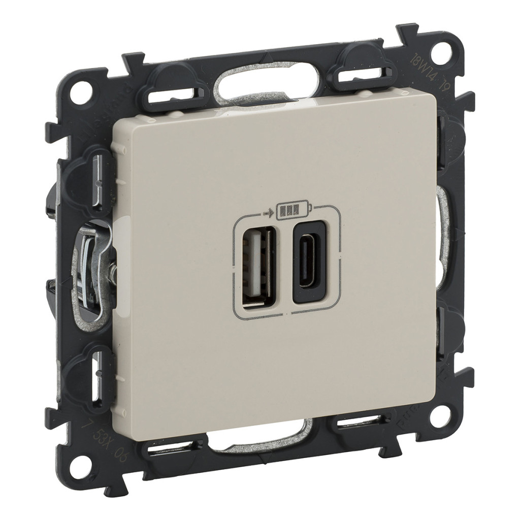 Priză de încărcare Valena Life Ivory cu conectori dubli USB tip C + USB tip A, 5 V–3 A–15 W, protecție la supratensiune >1 kW, clasa II SELV, 753206 Legrand
