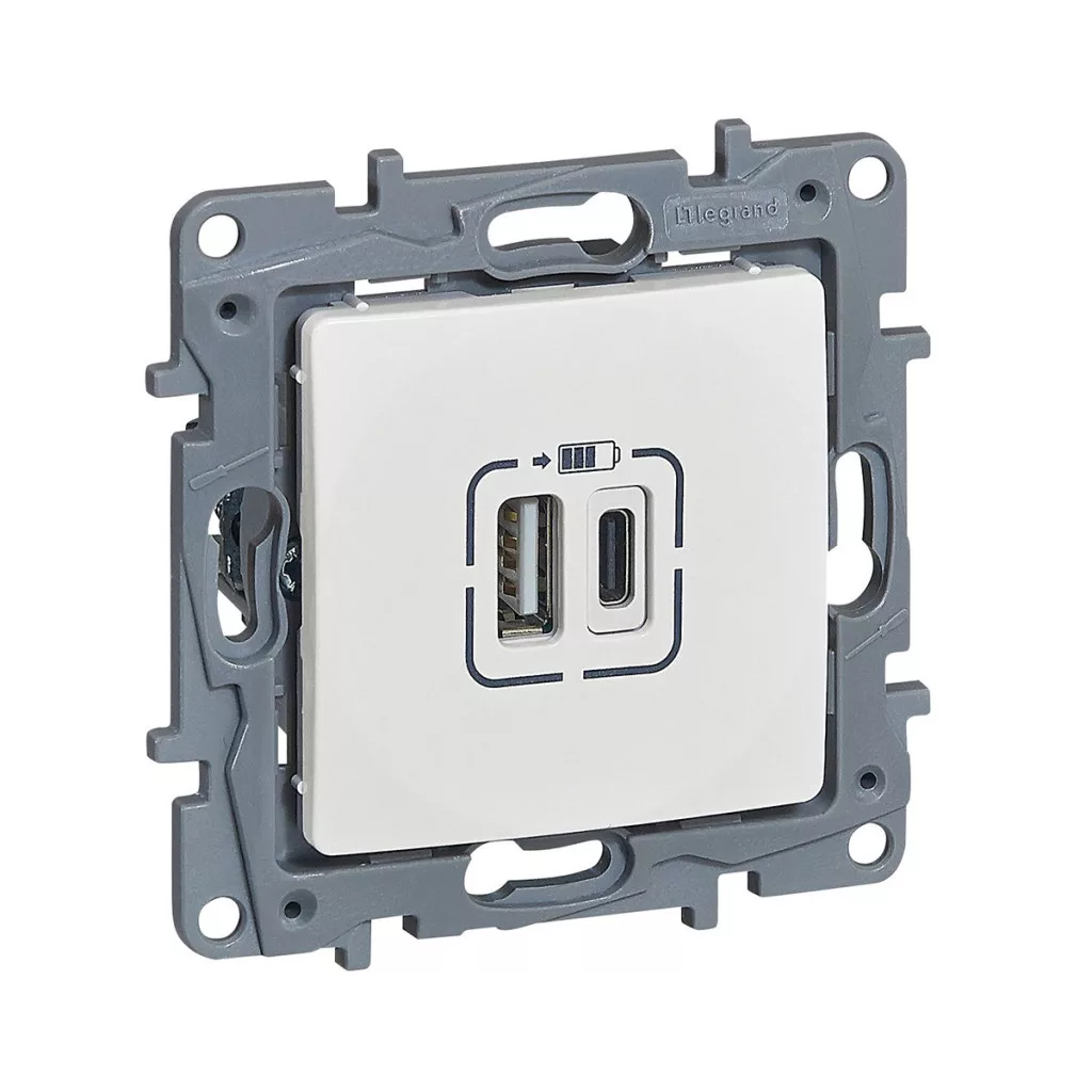Priză dublă de încărcare USB-A+C Legrand Niloé - 3 A - 15 W, albă - 764597