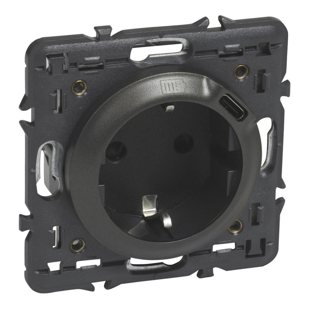 Legrand 067913 Priză Céliane 2P+F + priză de încărcare USB-C 1,5 A-5 V-7,5 W, fixare cu clemă/șurub, conexiune cu arc, grafit
