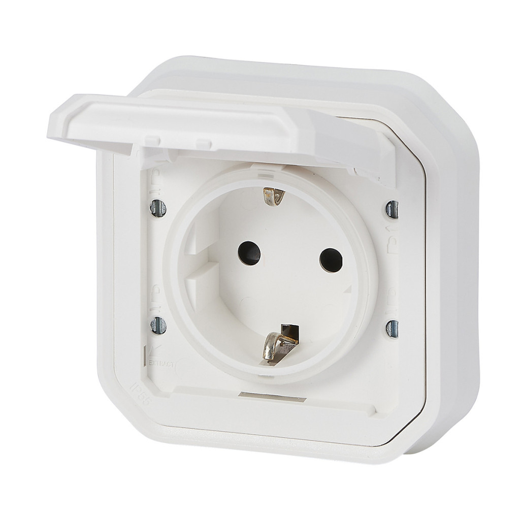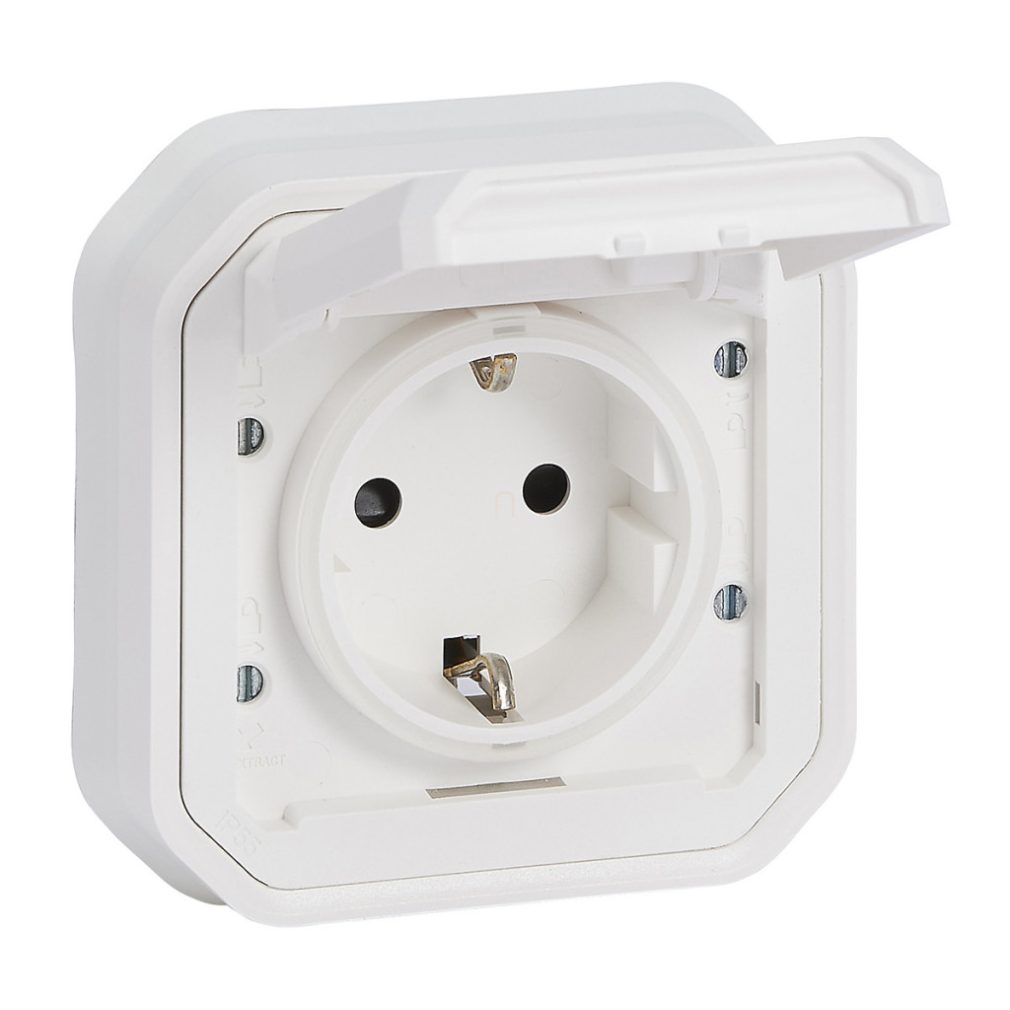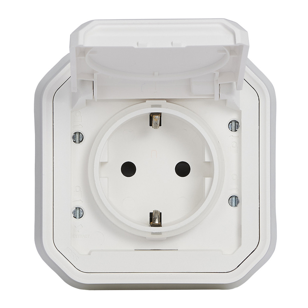 Priză încastrată Plexo 55 2P+F cu capac cu fixare prin clip, asamblată, cu inel de fixare și racord cu șurub, alb 069868L Legrand