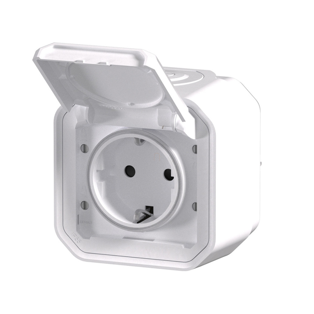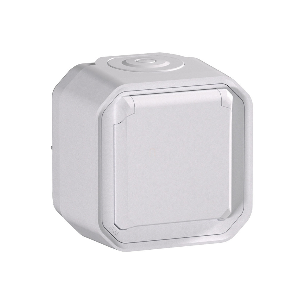 Priză Legrand Plexo 55 montată la suprafață, 2P+E, cu capac cu fixare prin clip, asamblată, cu cablaj cu arc, albă - 069770L