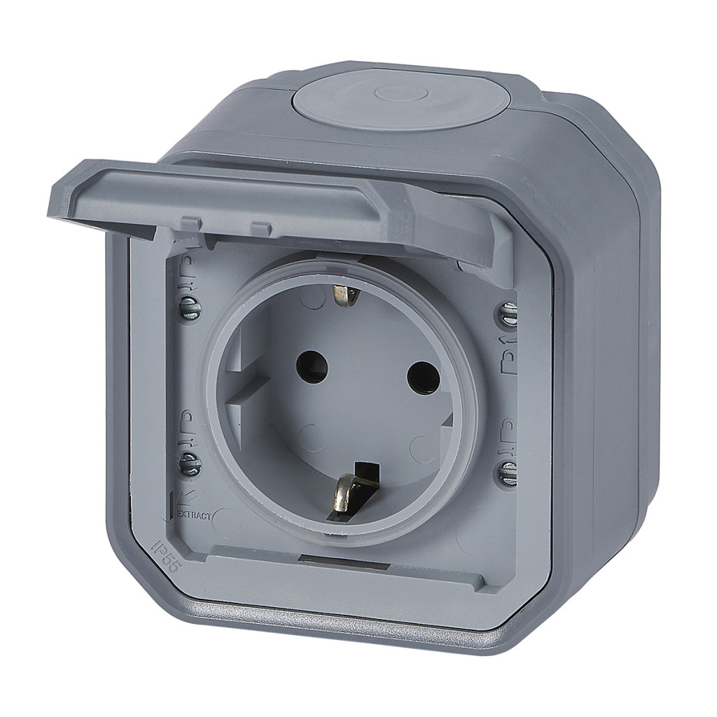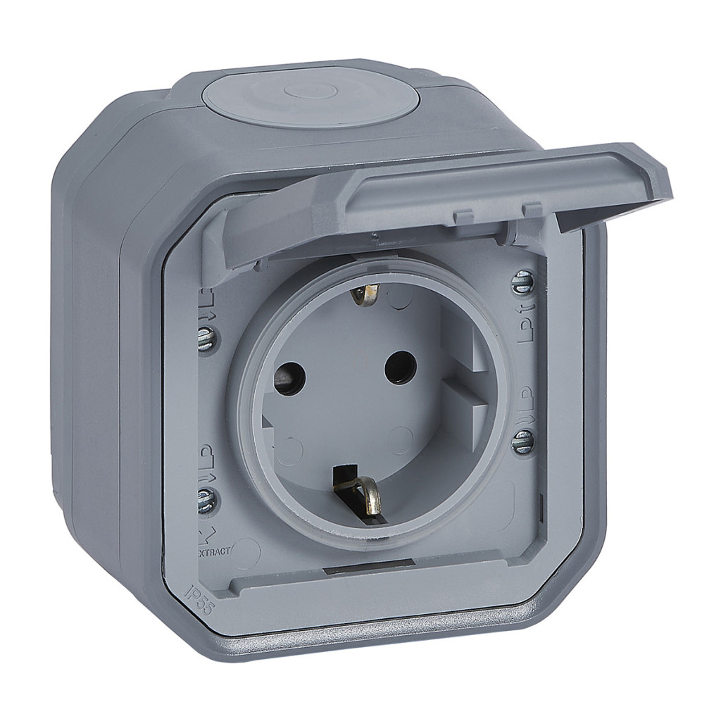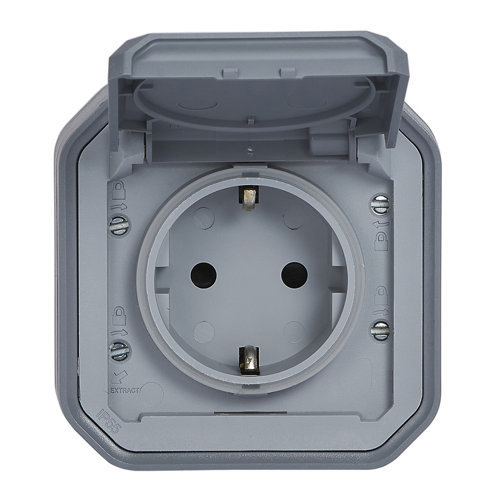 Priză Plexo 55 pentru perete exterior 2P+F cu capac cu fixare prin clip, asamblată, conexiune cu șurub, gri 069733L Legrand