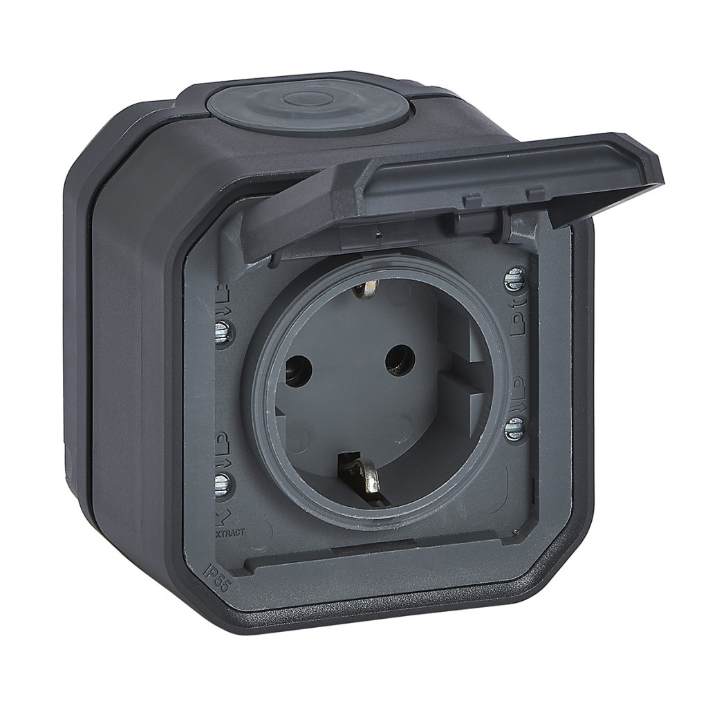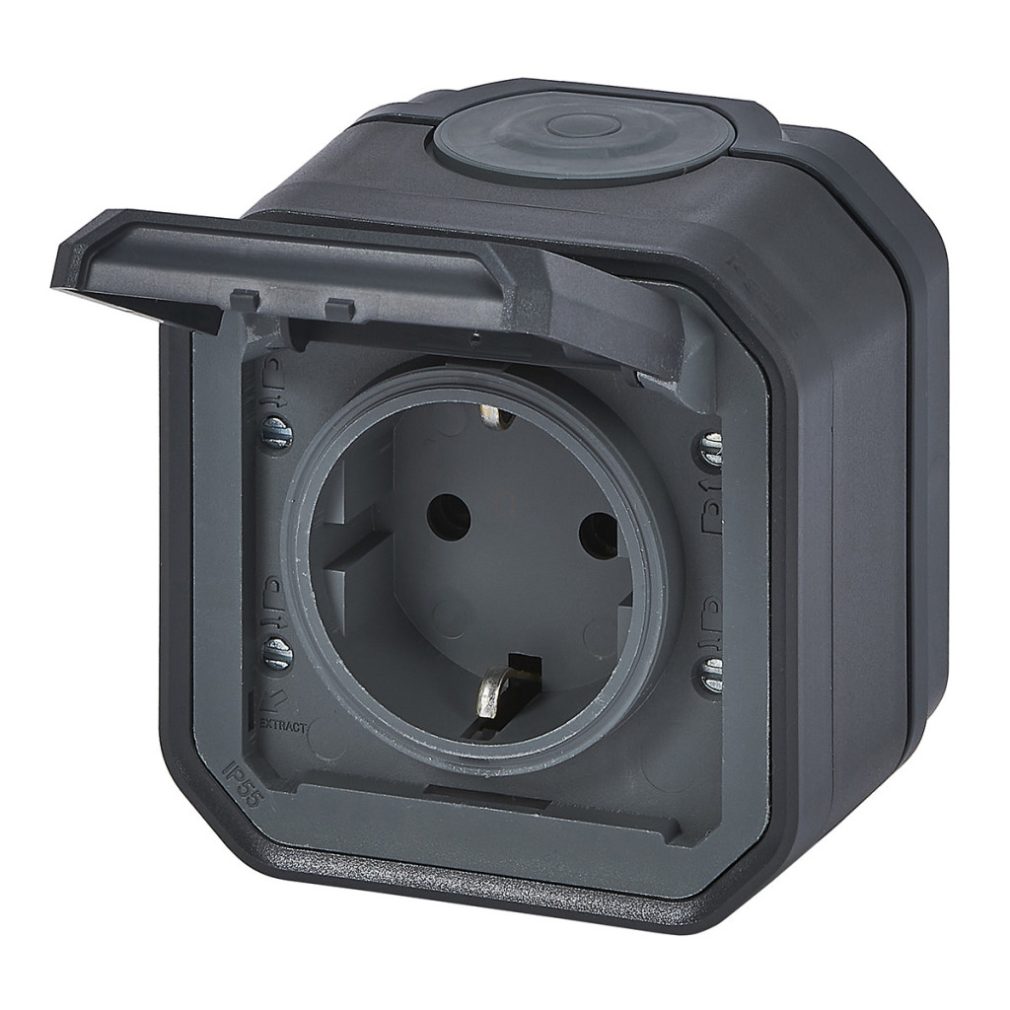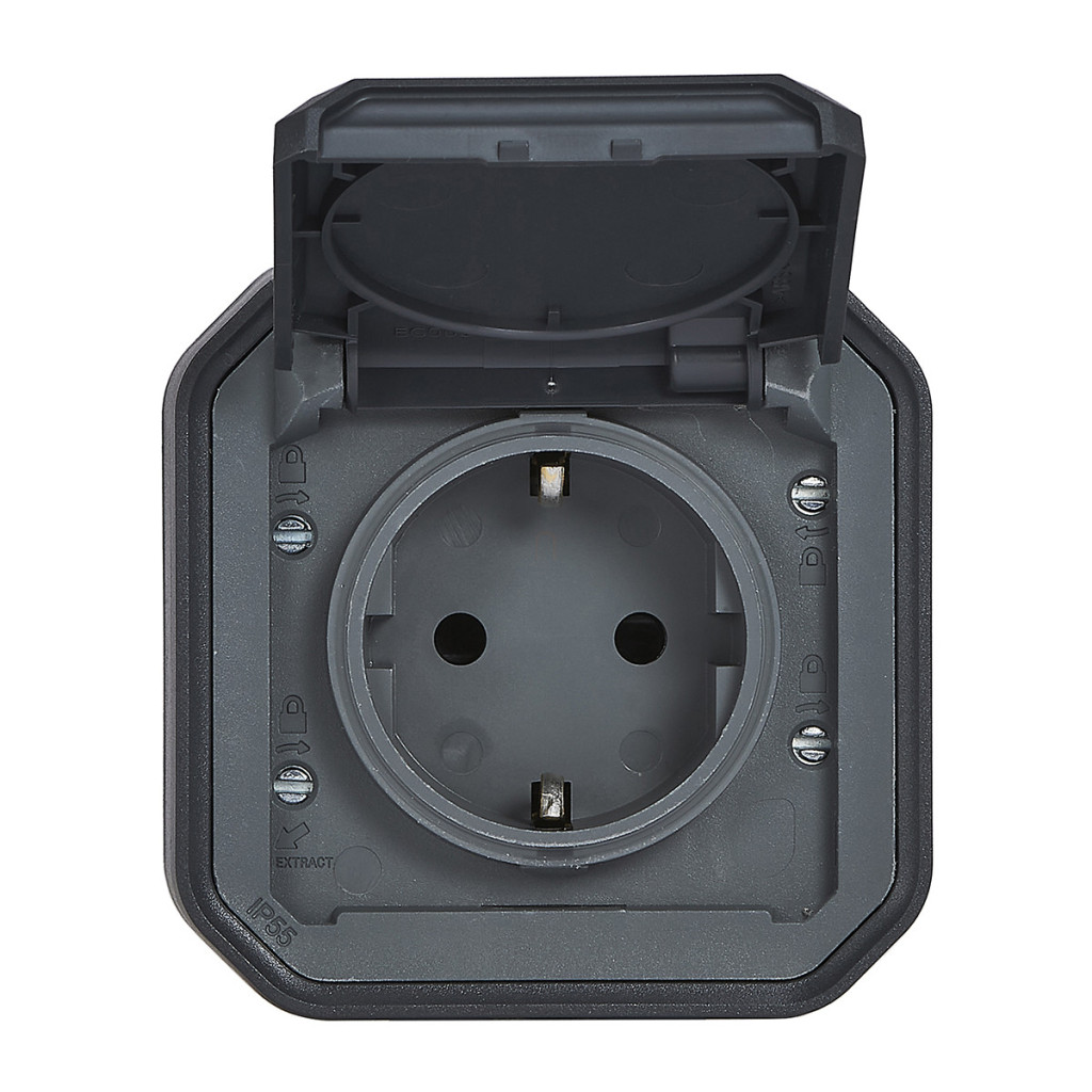 Priză Legrand Plexo 55 montată la suprafață, 2P+F, cu capac cu fixare rapidă, asamblată, cu cablaj cu arc, antracit - 069799L