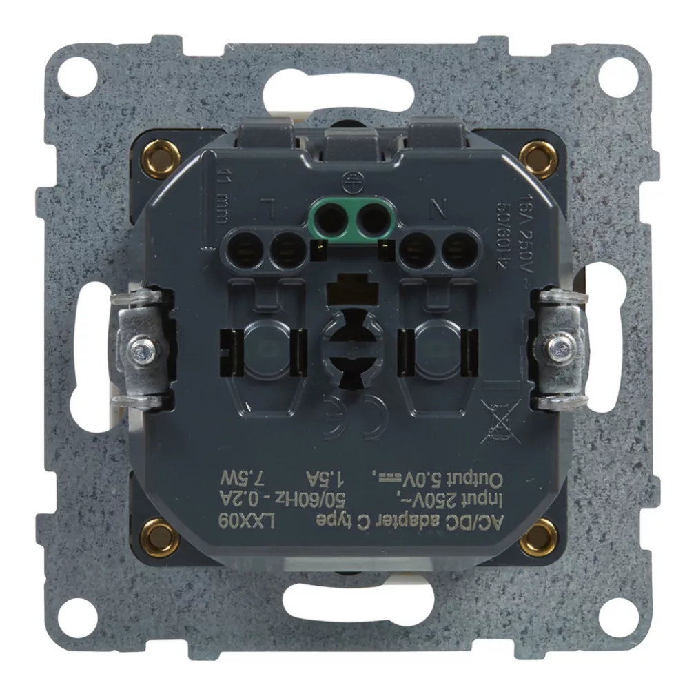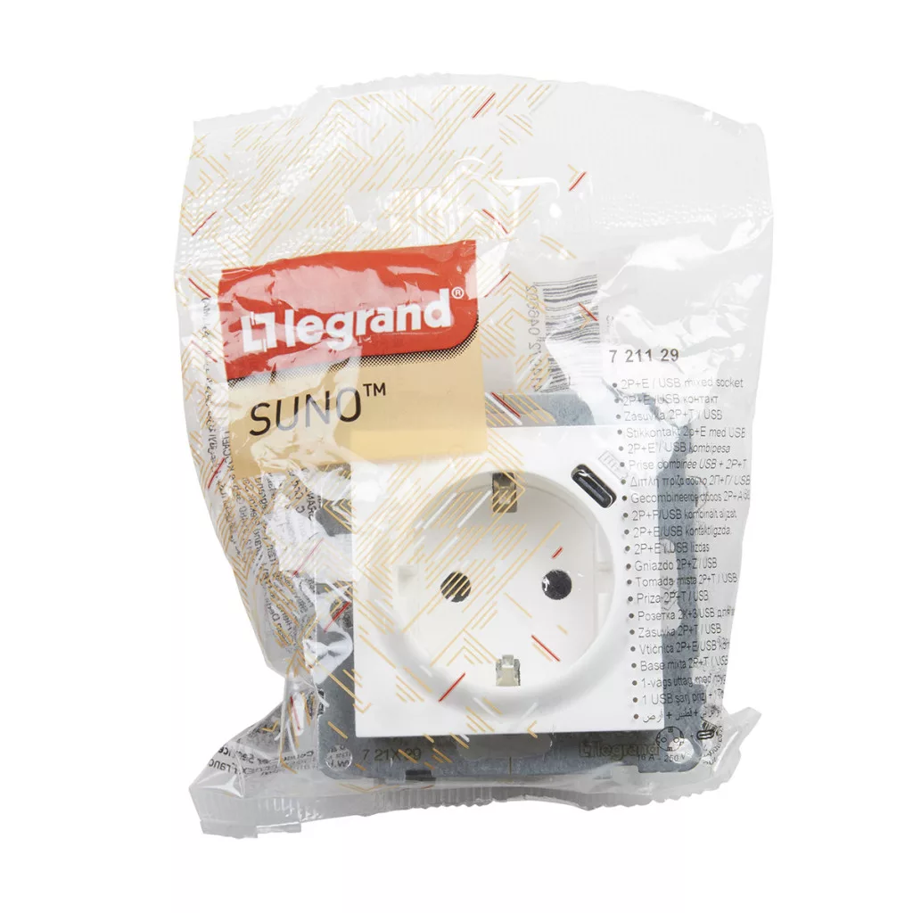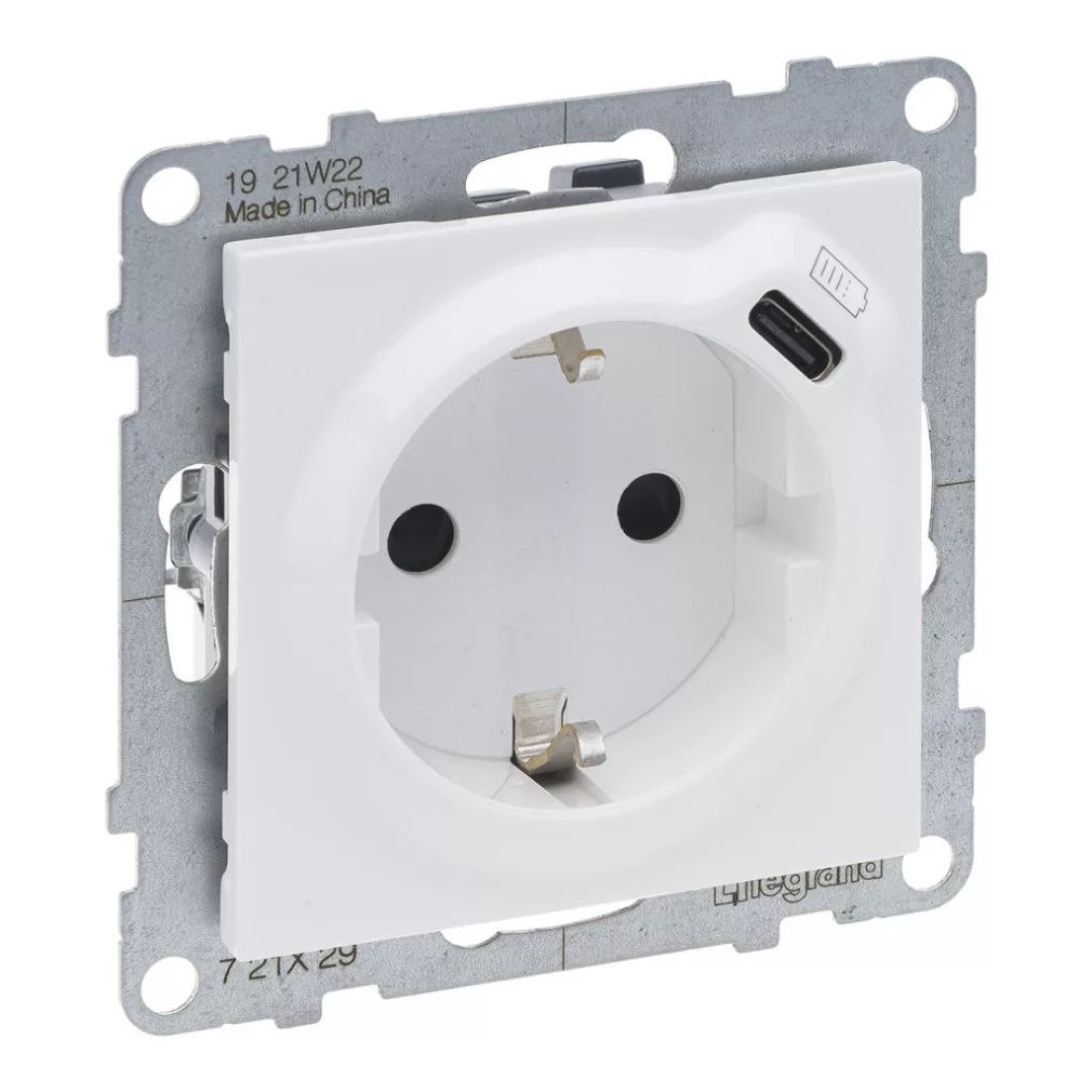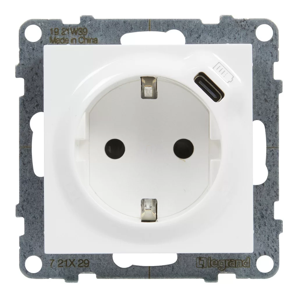 Suno alb 2P+F GYV + priză USB-C (cu arc), cu obturator de siguranță, fără ramă 721129 Legrand
