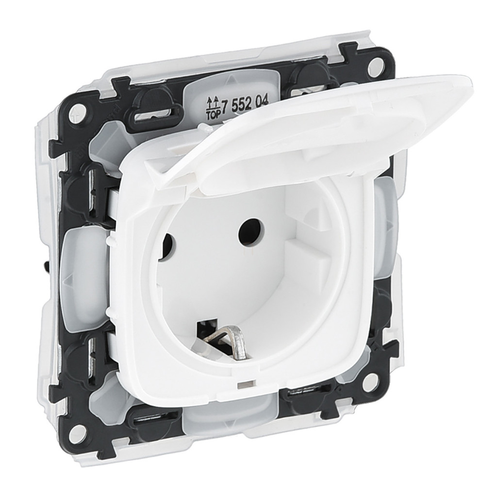 Priză Valena Allure albă 2P+F cu obturator de siguranță, capac cu fixare prin clip, IP44 albă 755204 Legrand