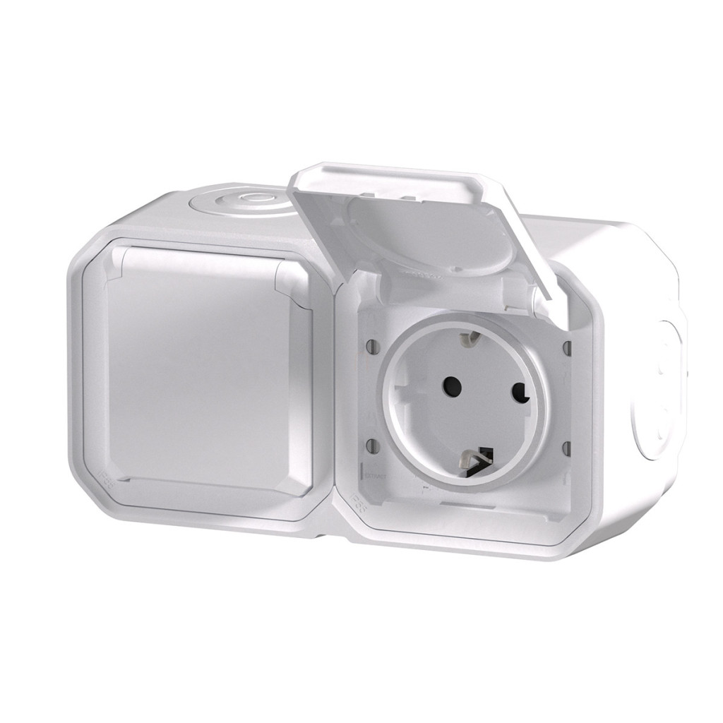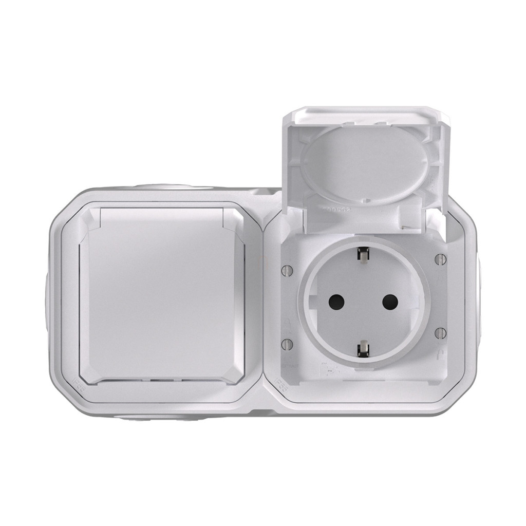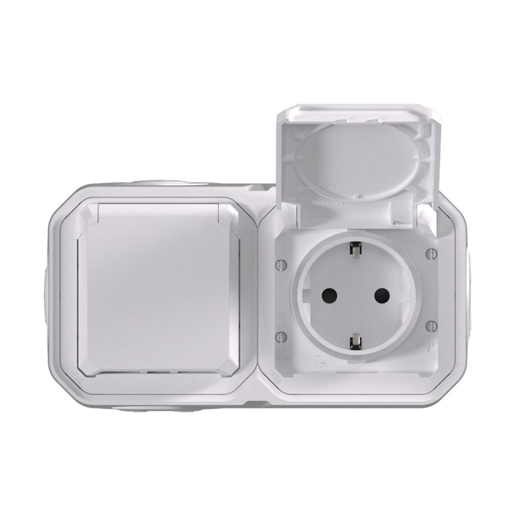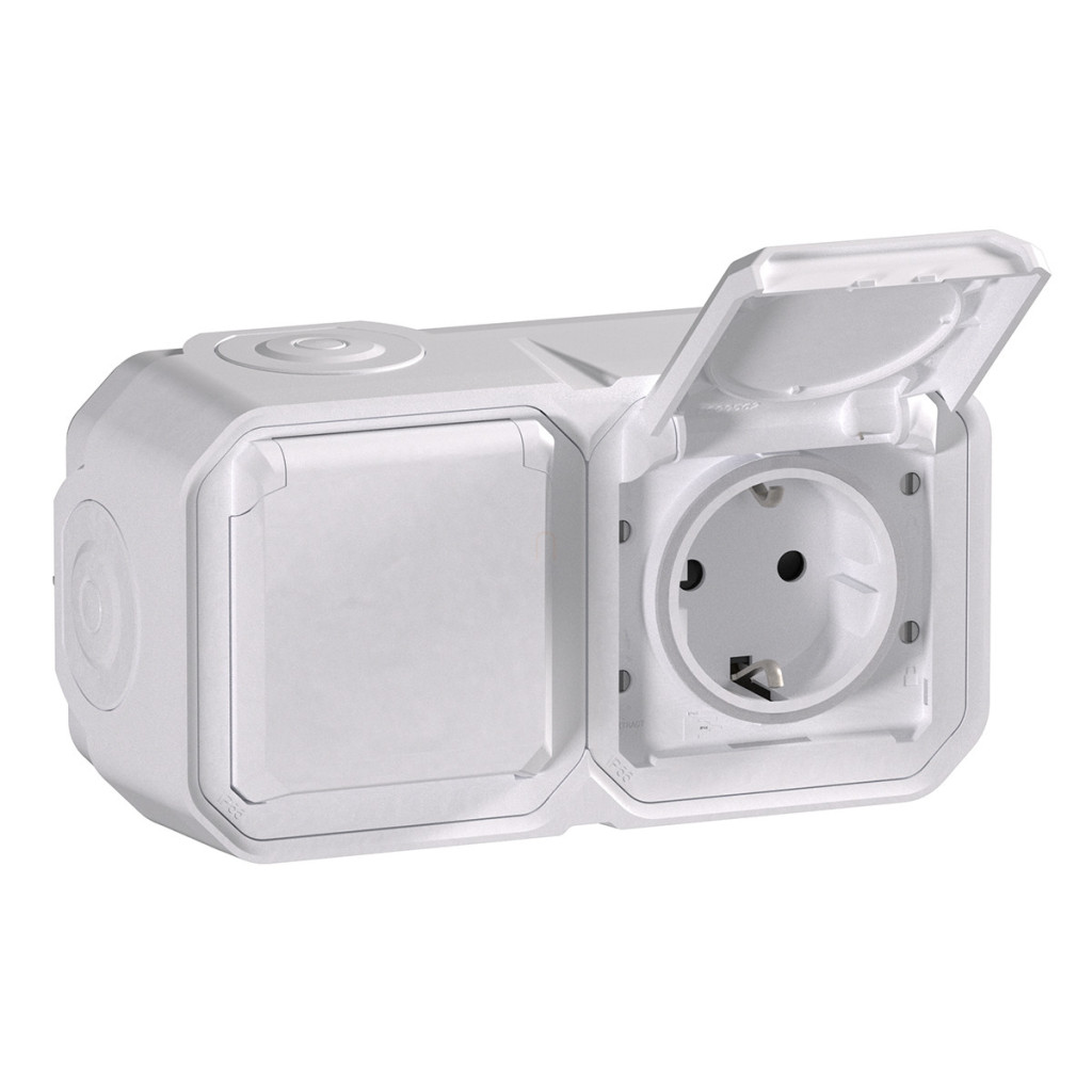 Plexo 55 priză externă pentru perete 2x2P+F pre-cablată orizontală cu capac cu fixare prin clip, asamblată, albă 069772L Legrand