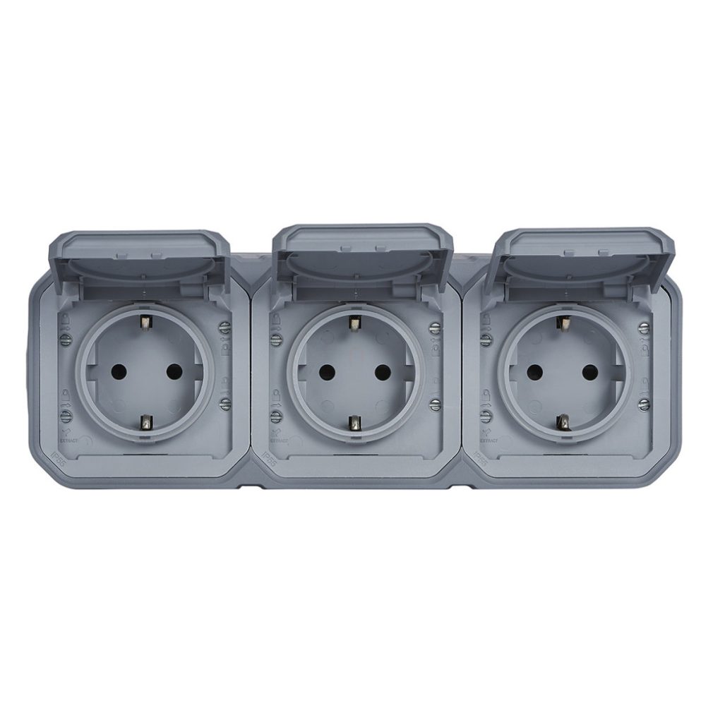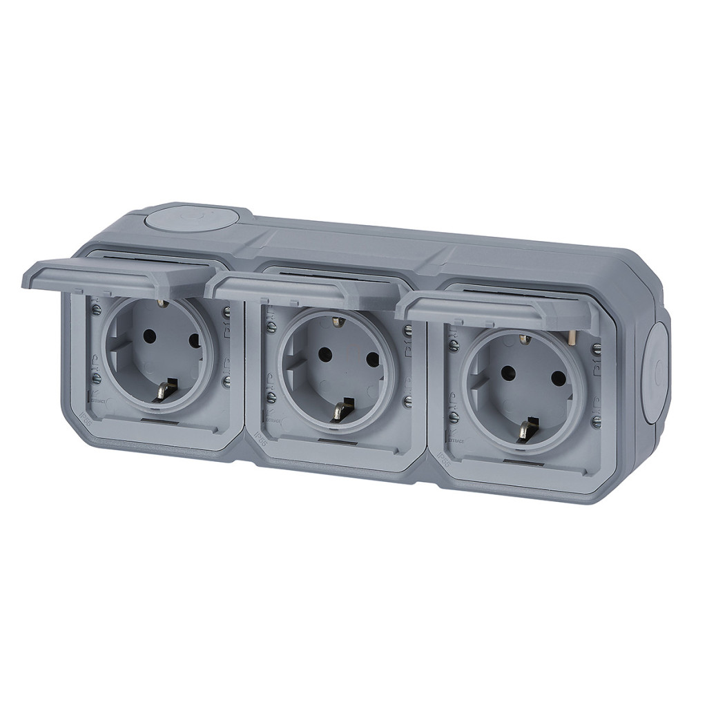 Plexo 55 priză de perete externă 3x2P+F pre-cablată orizontală cu capac cu fixare prin clip, asamblată, gri 069743L Legrand