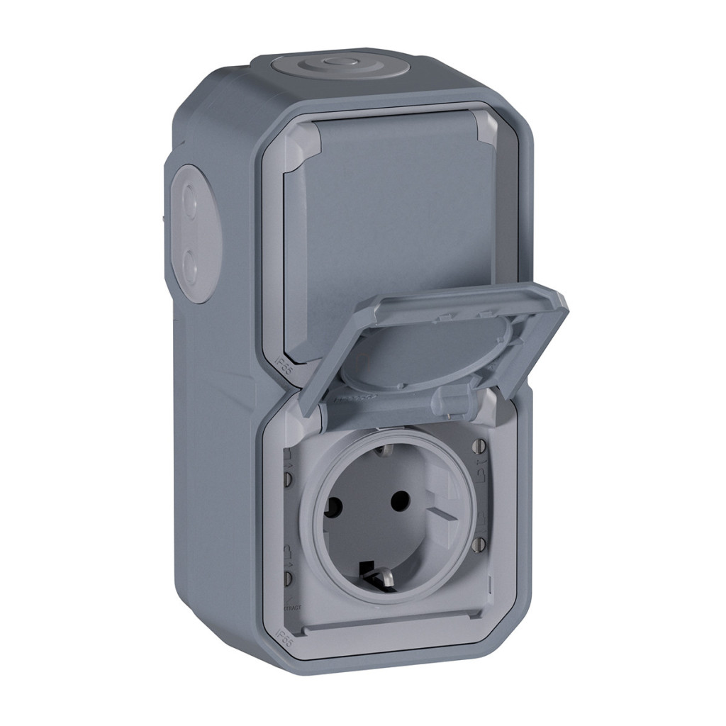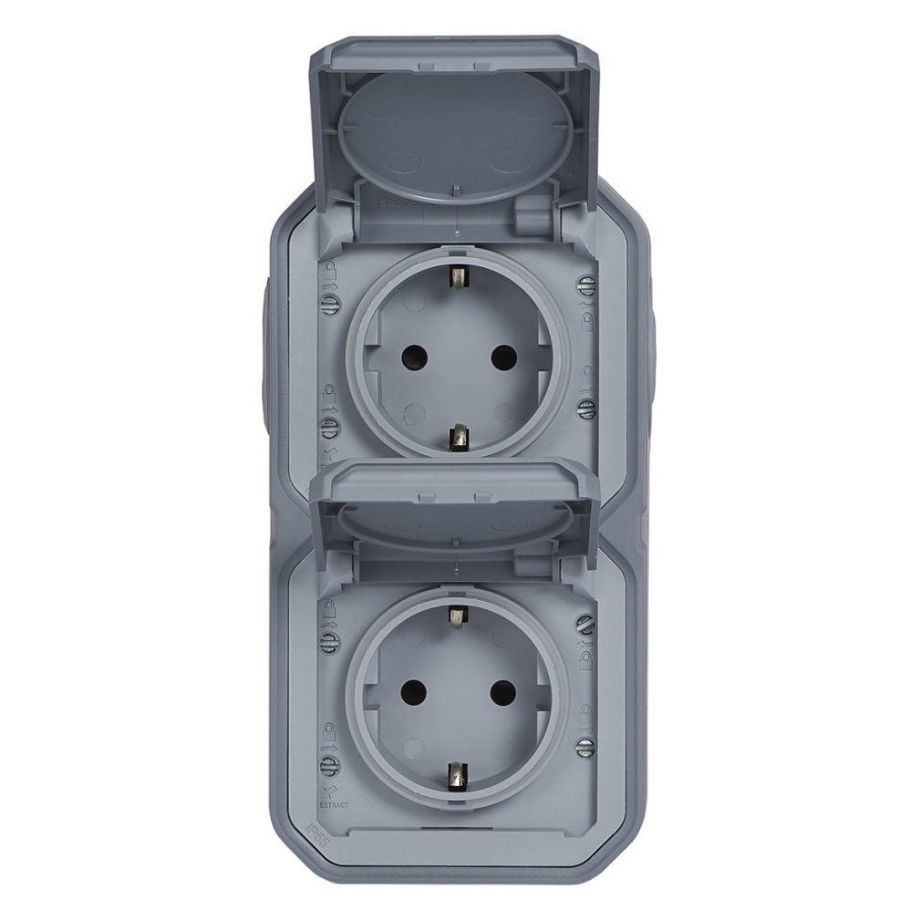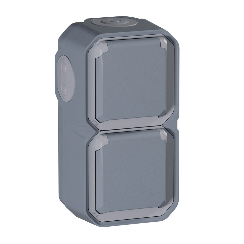 Plexo 55 priză verticală pentru perete exterior 2x2P+F pre-cablată cu capac cu fixare prin clip, asamblată, gri 069744L Legrand