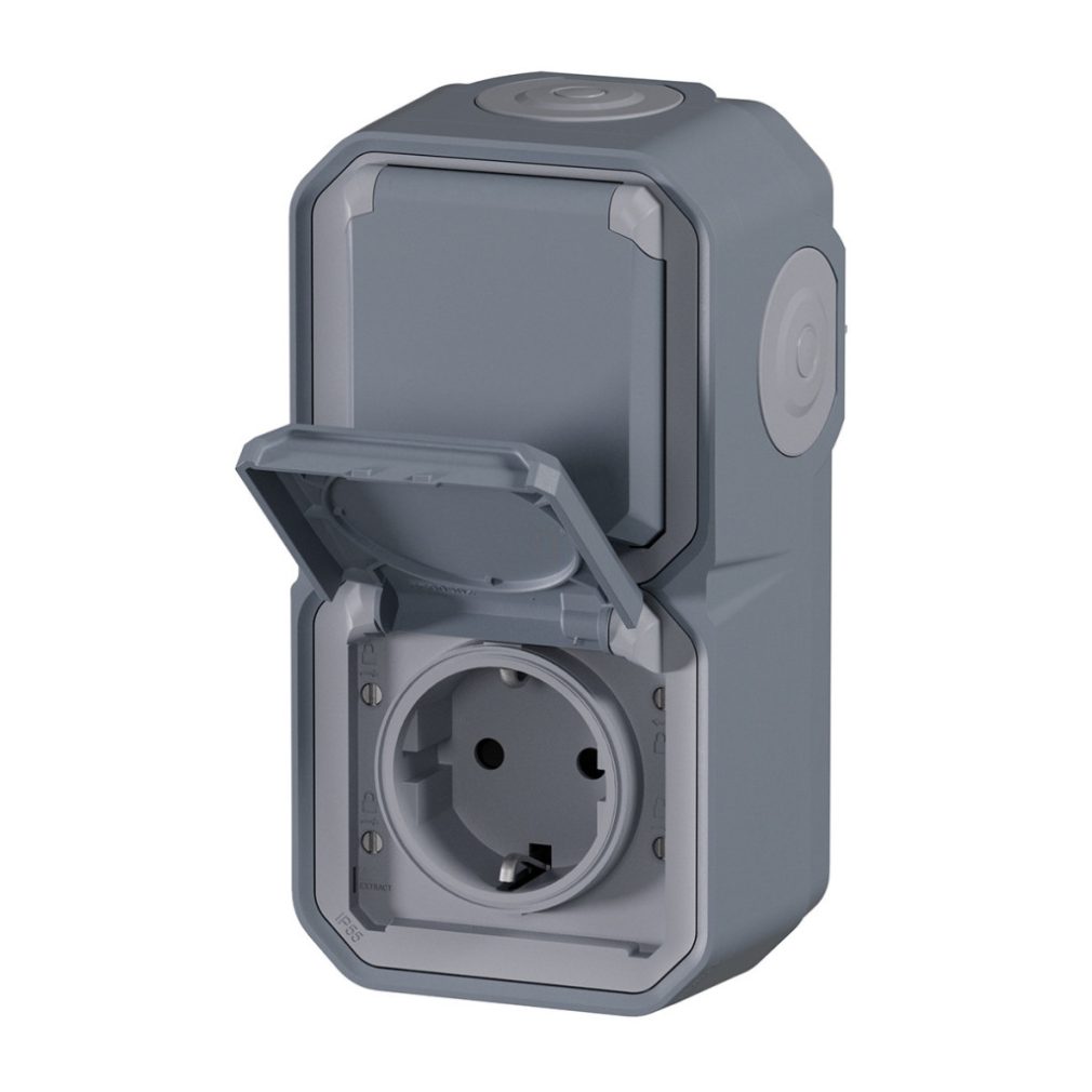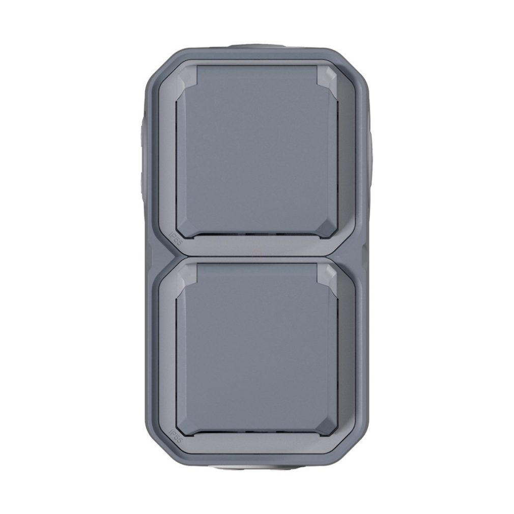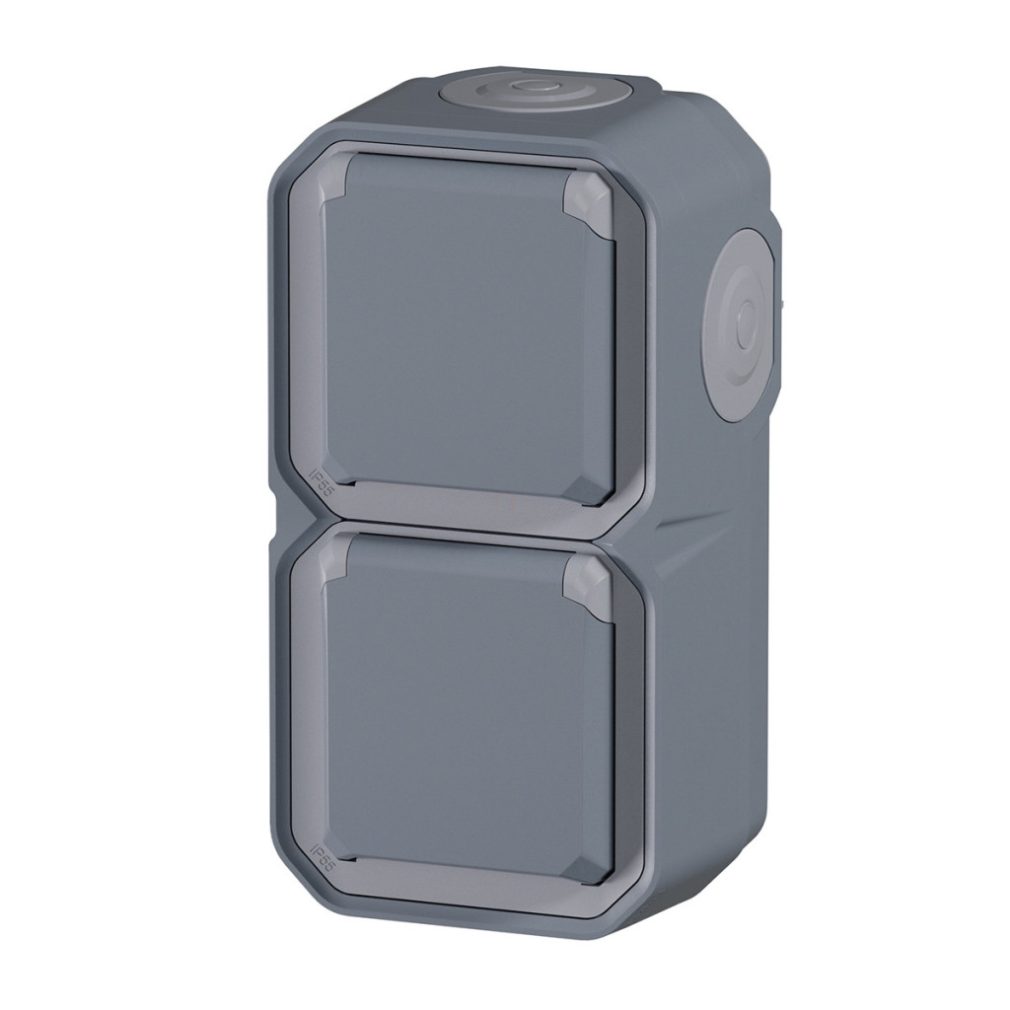 Plexo 55 priză verticală pentru perete exterior 2x2P+F pre-cablată cu capac cu fixare prin clip, asamblată, gri 069744L Legrand