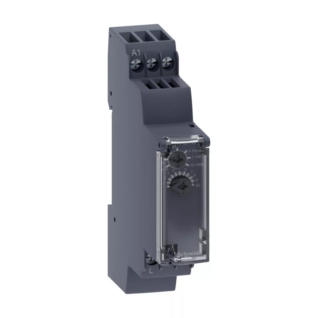 Acest releu temporizat Zelio RE17L poate fi setat într-un interval de la 0,1 secunde la 100 ore, are un curent maxim de ieșire de 0,7 A, are o lățime de 17,5 mm și poate fi acționat cu o tensiune de 24...Poate fi alimentat cu o sursă de alimentare de 240 V CA/CC. Are un contact de comutare 2C/O. Este unul dintre cele mai subțiri dispozitive disponibile pe piață, care poate fi montat flexibil și ușor pe o șină DIN, ocupând același spațiu ca orice dispozitiv modular unipolar DIN. Este disponibil cu un capac blocabil și poate fi reglat ușor și precis cu un buton rotativ de reglare fină. Lățime de 17,5 mm: dimensiunea sa este aceeași cu a oricărui întrerupător unipolar, facilitând proiectarea panoului. Temporizatorul cu funcție unică poate fi integrat cu ușurință în sisteme logice cablate: este soluția ideală pentru controlul echipamentelor și al sistemelor simple de automatizare fără PLC.