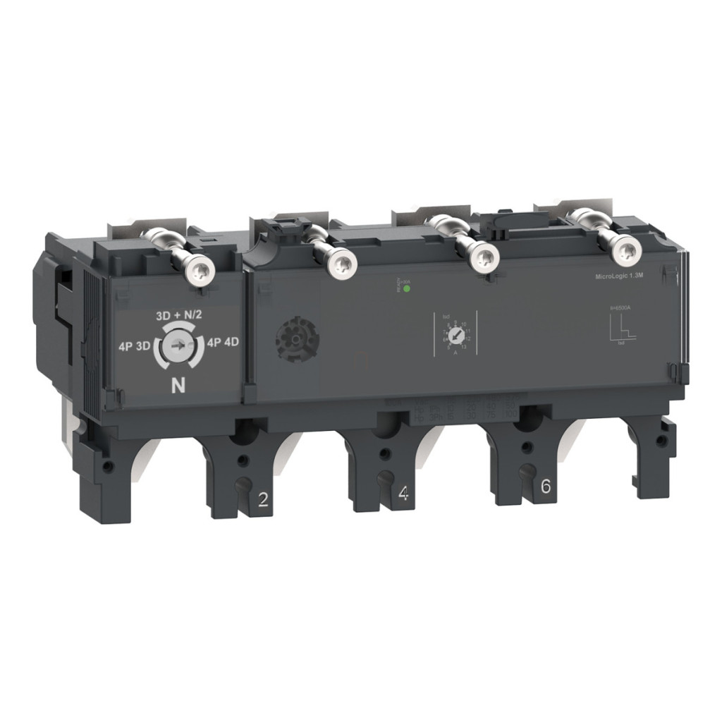 Acest MicroLogic 1,3 M este un declanșator electronic 4 poli, 3D, utilizat la întrerupătoarele ComPacT NSX 400/630. Această unitate de declanșare electronică cu o putere nominală de 320 A este alegerea optimă pentru aplicații de protecție a motoarelor. Oferă protecție reglabilă pe termen scurt și protecție instantanee fixă împotriva scurtcircuitelor. LED-ul verde Ready clipește când disjunctorul este gata să se declanșeze. Acest produs face parte din arhitectura noastră EcoStruxure Power când este asociat cu cadrele de bază PowerTag NSX și ComPacT NSX.