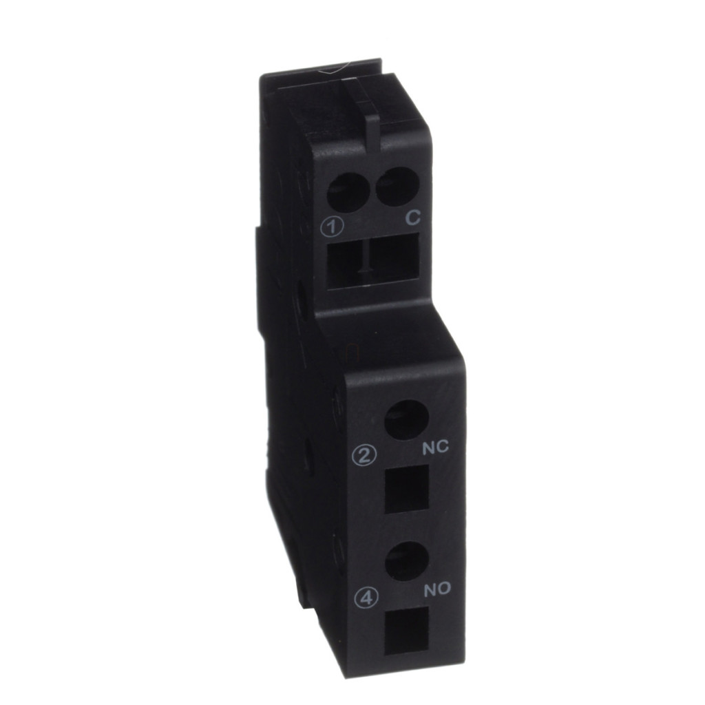 Acesta este un contact auxiliar standard care furnizează două informații la distanță despre starea întrerupătorului de circuit. Se utilizează pe dispozitivele Compact NSXm și PowerPact B. Contactul OF (deschis/închis) indică poziția contactelor principale ale întrerupătorului de circuit. Contactul SD (indicator de declanșare) indică dacă întrerupătorul de circuit s-a declanșat. Există un model de contact auxiliar pentru informații OF și SD, iar funcția acestuia depinde de locul în care este instalat dispozitivul. Acest contact auxiliar este un contact comun de tip comutator cu 1 contact normal deschis și 1 contact normal închis. Curentul nominal este de 5 A, iar sarcina minimă este de 2 mA pentru 17 V CC. Categorii de aplicare: AC12/AC13/DC12/DC13/DC14. Compact NSXm are 2 contacte auxiliare, care sunt vizibile din față cu indicatoare verzi. Conform cu IEC 60947-5-1.
