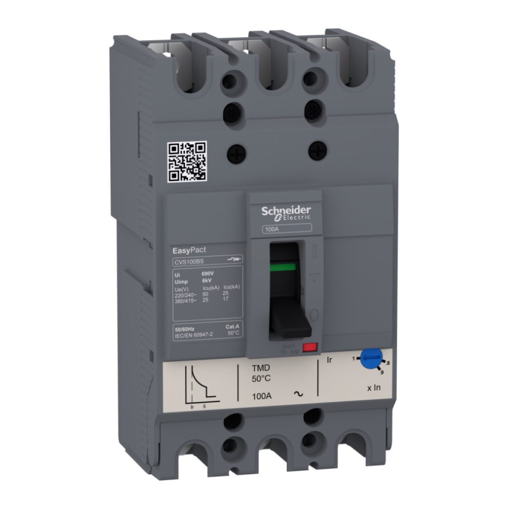 EasyPact CVS100BS 3p 25kA disjunctor complet TM63D 3p3D cu declanșator. Familie de produse: Easypact CVS100...160 - tipul produsului sau al componentei: întrerupător de circuit - aplicația dispozitivului: distribuție - descrierea polilor protejați: 3d - tip rețea: CA - capacitate de întrerupere: 25 kA Icu conform cu IEC 60947-2 -380/400 V CA 50/60 Hz, 25 kA Icu conform cu IEC 60947-2 -415 V c.a. 50/60 Hz, 25 kA Icu conform cu IEC 60947-2 -440 V c.a. 50/60 Hz, 50 kA Icu conform cu IEC 60947-2 -200/240 V c.a. 50/60 Hz - categorie de utilizare: Categoria A - denumirea unității de declanșare: TM-D - tehnologia unității de declanșare: termomagnetică - tipul de protecție: protecție instantanee la scurtcircuit, protecție la suprasarcină (continuă). Avantaje: Caracteristici excepționale și protecții termice reglabile. Ușurință în selectare, achiziție, stocare și instalare. Aplicații: ..