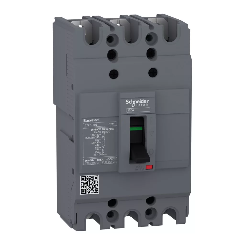 Întrerupător de circuit Easypact EZC100N, TMD, 100A, 3 poli 3d. familie de produse: EasyPact - tipul produsului sau al componentei: întrerupător - denumirea scurtă a dispozitivului: Easypact EZC100N - denumirea întrerupătorului: Easypact EZC100N - aplicația dispozitivului: distribuție - descrierea polilor protejați: 3t - tip rețea: CA, CC - frecvență rețea: 50/60 Hz - tensiune nominală de funcționare Ue: 250 V CC conform cu IEC 60947-2, 550 V c.a. 50/60 Hz conform cu IEC 60947-2 - codul valorilor nominale ale întrerupătorului de circuit: N - capacitate de întrerupere: 10 kA Icu -440 V c.a. 50/60 Hz conform cu IEC 60947-2, 15 kA Icu -400...415 V c.a. 50/60 Hz este conform cu IEC 60947-2, 18 kA Icu -380 V c.a. 50/60 Hz este conform cu IEC 60947-2, 25 kA Icu -110...130 V CA 50/60 Hz conform cu IEC 60947-2, 25 kA Icu -220...240 V CA 50/60 Hz este conform cu IEC 60947-2, 5 kA Icu -125 V CC 1P este conform cu IEC 60947-2, 5 kA Icu -250 V CC 2P este conform cu IEC 60947-2, 5 kA Icu -550 V CA 50/60 Hz conform cu IEC 60947-2 - Capacitate nominală de rupere Ics: Ics 12,5 kA 110/130 V CA 50/60 Hz conform cu IEC 60947-2, Ics 12,5 kA 220/230/240 V CA 50/60 Hz este conform cu IEC 60947-2, Ics 2,5 kA 125 V CC este conform cu IEC 60947-2, Ics 2,5 kA 250 V CC este conform cu IEC 60947-2, Ics 2,5 kA 550 V CA 50/60 Hz este conform cu IEC 60947-2, Ics 5 kA 440 V CA 50/60 Hz este conform cu IEC 60947-2, Ics 7,5 kA 400/415 V c.a. 50/60 Hz este conform cu IEC 60947-2, Ics 9 kA 380 V c.a. 50/60 Hz este conform cu IEC 60947-2 - categoria de utilizare: Categoria A - denumirea unității de declanșare: TM-D - tehnologia unității de declanșare: termomagnetică - tipul de protecție: protecție la scurtcircuit, protecție la scurtcircuit - grad de poluare: 3 conform IEC 60664-1, 3 conform IEC 947-1. Avantaje: Cu soluția lor simplă și 3 dimensiuni fizice, întrerupătoarele Easypact oferă un răspuns simplu la protecția rețelelor de joasă tensiune. Ușor de selectat, ușor de instalat, ușor de utilizat. Easypact este simplu de la început până la sfârșit! Aplicații: Protecție în rețelele de joasă tensiune cu o capacitate maximă de întrerupere de 50 kA/415 V și un curent nominal care nu depășește 630 A: Instalații rezidențiale, instalații industriale și de servicii.