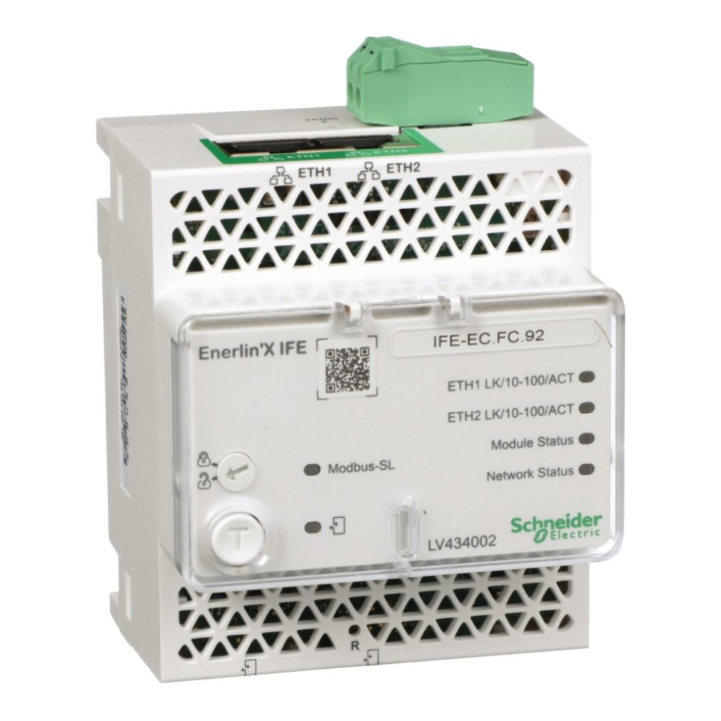 \nInterfață Ethernet IFE și gateway. Denumire scurtă a dispozitivului: IFE - Tipul produsului sau componentului: Modul de interfață - Compatibilitate gamă: Compact NS1600b...3200, Compact NS630b...1600, Compact NSX, Masterpact MTZ, Masterpact NT, Masterpact NW, PowerPact H, PowerPact J, PowerPact L. Avantaje: Cale directă către eficiența energetică, Siguranță și protecție, Măsurarea energiei (măsurarea consumului, kWh) și control, Disponibilitate crescută a energiei. Aplicații: Protecția și gestionarea echipamentelor electrice de joasă tensiune:, Aplicații standard: instalații industriale, clădiri, infrastructură, Performanță ridicată, prețuri controlate: procese industriale, industria metalurgică, transport maritim, Protecția motorului, Control și deconectare, comutatoare secționale, sisteme de comutare.. Avantaje: Cel mai mic întrerupător de circuit din lume combină cerințele tehnice ale celor mai exigente aplicații într-o dimensiune compactă. Întrerupătorul de circuit Masterpact NT optimizează astfel rețeaua electrică și garantează o funcționare fiabilă.... Aplicații: Protecție, măsurare și comunicare în rețelele de joasă tensiune, în special pentru următoarele sarcini: Aplicație specială:... Avantaje: Unde performanța contează Familia de întrerupătoare Masterpact NW se caracterizează prin dimensiunea optimă: nu numai că amprenta a fost redusă, dar un total de 3 dimensiuni sunt suficiente pentru a acoperi întreaga gamă de curent nominal. De la 630 la 6300 A. În proiectele de rețele din ce în ce mai complexe, întrerupătoarele Masterpact NW joacă un rol foarte important în atingerea obiectivului de standardizare a aparatelor de comutație, datorită gamei și simplității lor.... Aplicații: Implementarea funcțiilor de protecție, măsurare și comunicare în rețelele de joasă tensiune, în special pentru următoarele sarcini: Protecția motoarelor, Protecția generatoarelor. Aplicații speciale: Rețele de curent continuu, Protecție în medii industriale foarte poluate și corozive, Tuneluri (1000 V), Aeroporturi (400 Hz), Marina militară. Avantaje: • Detectarea automată a dispozitivelor Modbus SL • Poate fi montat pe o șină DIN. Aplicații: • Interfață de comunicare Ethernet pentru întrerupătoare de joasă tensiune • Dispozitiv principal pentru conexiune Modbus SL.