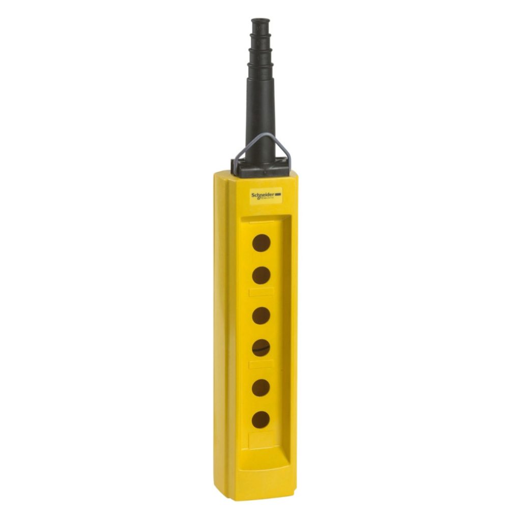 \nCarcasă pentru comutator suspendat, goală, 6 orificii. Familie de produse: Harmony XAC - Tip de produs sau componentă: stație de comandă suspendată. Avantaje: Proiectate pentru manipularea mecanică a materialelor, aceste comutatoare suspendate extrem de durabile sunt conforme cu standardele de siguranță IEC. Nu numai că sunt simple și intuitive, dar sunt și extrem de convenabile de utilizat.... Aplicații: - Industria și sectorul serviciilor: mașini de ridicat, macarale mobile...