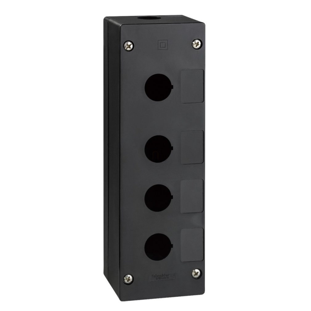 \nCutie pentru medii dificile - negru - 4 decupaje - 4 deschideri verticale. Familia de produse: Harmony XALG - Tipul produsului sau componentului: stație de control goală - Denumirea scurtă a dispozitivului: XALG - Aplicația produsului: pentru unități de control și semnalizare XB5 Ø 22 mm - Caracteristici de mediu: medii dure - Nivel de protecție IP: IP66 conform IEC 60529, IP67 conform IEC 60529, IP69, IP69K. Avantaje: Proiectată pentru condiții de mediu dificile. Cu carcasele sale ușor de instalat, seria XALG este proiectată pentru utilizare în condiții de mediu dificile. Carcasele extrem de robuste oferă un grad ridicat de protecție (IP66, IP69K) și sunt rezistente la curățarea cu presiune înaltă și la substanțe chimice.... Aplicații: - Industria alimentară: ferme de animale, producția/prelucrarea alimentelor și băuturilor, gestionarea apei, producția de cereale și fructe, sectorul maritim: acvacultură, construcția și întreținerea navelor, sectorul serviciilor: construcția de clădiri, tratarea apei și a apelor uzate. Avantaje: Soluție pentru ascensoare. Cu performanțele sale remarcabile, gama de produse Harmony XALF este soluția ideală pentru problemele legate de siguranța și coordonarea ascensoarelor. Pentru a reduce timpul de nefuncționare a echipamentelor, aceste dispozitive se caracterizează prin modularitate și simplitate la instalarea dispozitivelor de control și semnalizare din seria Harmony XB5/XB7.... Aplicații: - Aceste dispozitive pot fi utilizate pentru controlul mișcării ascensoarelor. Atunci când sunt utilizate împreună cu alte dispozitive de control, ele simplifică operațiunile de inspecție și reparație....
