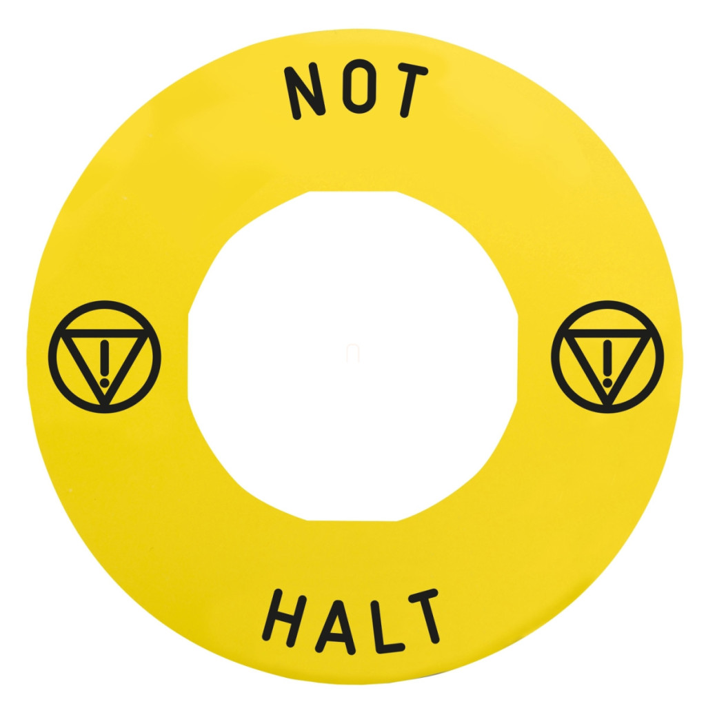 Schneider Electric Harmony XB4 - ZBY9230T - etichetă marcată Ø60 - pentru oprire de urgență - NOT-HALT/logo ISO13850