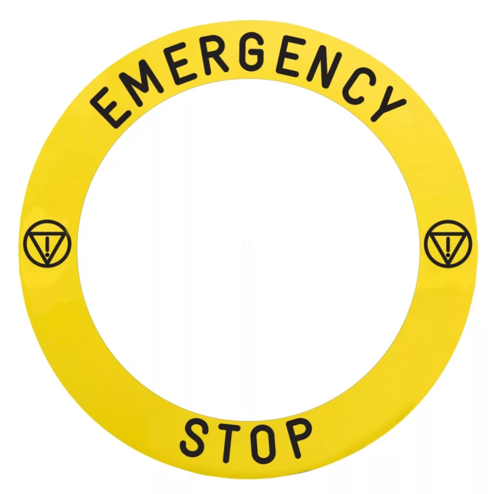 Schneider Electric Harmony XB5 - ZBY8L330 - semn circular galben, Ø90, ZB5AS84W** pentru oprire de urgență, cu logo, date tehnice OPRIRE DE URGENȚĂ