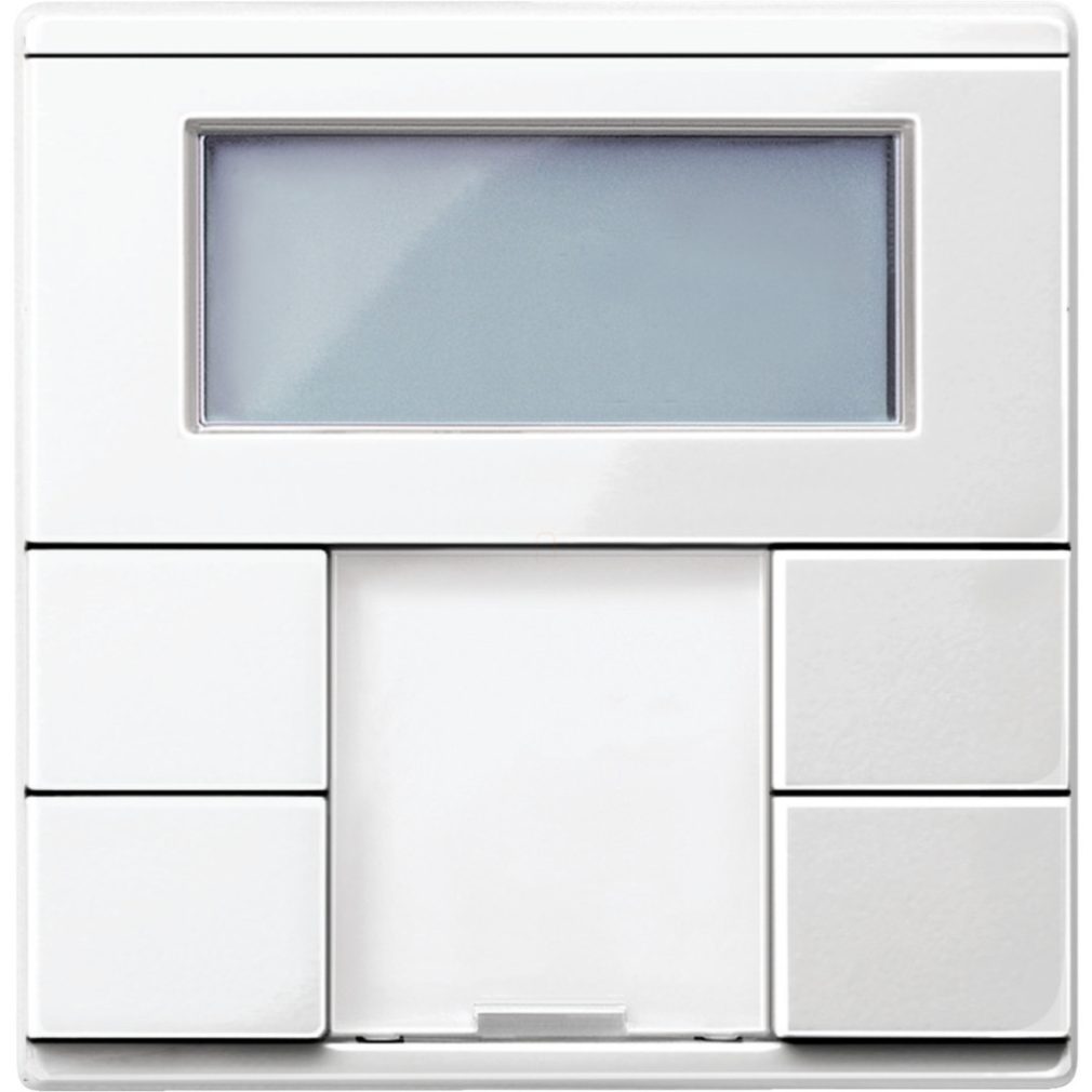 Buton cu 2 prize plus unitate de control al temperaturii camerei. Pentru System M. Unitate de control convenabilă cu 4 butoane de control, afișaj de funcționare și stare și câmp de etichetare. Afișajul de funcționare poate fi utilizat și ca lampă de orientare. Cu unitate de control al temperaturii camerei și afișaj. Cu 5 LED-uri roșii. Unitatea de control al temperaturii camerei poate fi utilizată pentru încălzire și răcire cu servomotoare KNX reglabile continuu sau pentru declanșarea actuatoarelor de comutare și a actuatoarelor de încălzire. Cu afișaj alb retroiluminat pentru afișarea, de exemplu, a orei, datei, temperaturii și modului de funcționare. Meniu pentru setarea modurilor de funcționare implicite, a valorii de referință, a zilei lucrătoare/sărbătorii (declanșare externă), a modului de afișare, a orei, a orelor de comutare și a luminozității afișajului. Butoanele pot fi parametrizate liber ca pereche de butoane (suprafață dublă) sau ca buton unic. Cu cuplaj de bus integrat. Busul este conectat printr-un terminal de conectare bus. Funcții buton: Comutare, comutare alternativă, reglare intensitate luminoasă, control jaluzele (relativ sau absolut), impulsuri declanșează telegrame de 1, 2, 4 sau 8 biți (distincție între funcționare scurtă și lungă). Fronturi de impuls cu telegrame de 2 octeți (distincție între funcționare scurtă și lungă), controler liniar de 8 biți, rechemare scenă, salvare scenă, funcții de dezactivare. Control temporizat cu sincronizare, funcții de notificare, citire ciclică a valorilor temperaturii externe, control ventilator, moduri de funcționare, valori implicite de mișcare. Funcții de control al temperaturii camerei: Tip controler: control în 2 trepte, controler PI continuu, controler PI comutator (PWM). Ieșire: interval continuu 0-100% sau comutare ON/OFF. Mod de funcționare al controlerului: Încălzire cu o ieșire a controlerului. Răcire cu o ieșire a controlerului. Încălzire și răcire cu ieșiri separate ale controlerului. Încălzire și răcire cu o ieșire a controlerului. Încălzire în 2 trepte cu 2 ieșiri de control. Răcire în 2 trepte cu 2 ieșiri de control. Încălzire și răcire în 2 trepte cu 4 ieșiri de control. Moduri de funcționare: Confort, extindere confort, standby, reducere nocturnă, protecție împotriva înghețului/căldurii. Transferul tuturor semnalelor de bază, salvarea tuturor temperaturilor semnalelor de bază și a modurilor de funcționare la resetare, monitorizarea temperaturii externe, ieșire suplimentară a valorii de control ca valoare de 1 octet pe PWM. Conexiune bus cu terminal și placă de fixare. Șurub pentru protecție împotriva manipulării. Capac de protecție pentru tencuire. Material: termoplastic strălucitor. Culoare: alb polar, lucios.