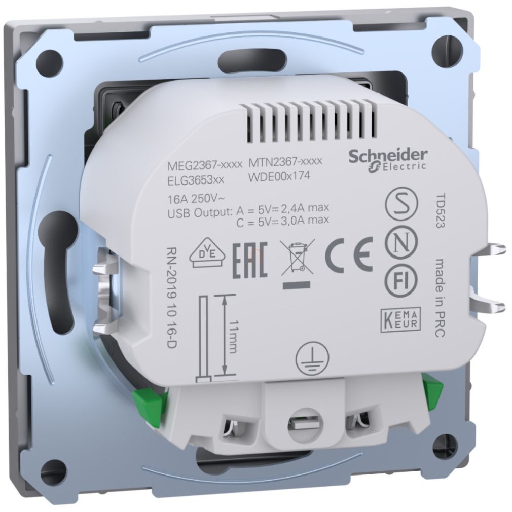 Priză MERTEN 2P+F, cu obturator de siguranță, încărcător USB A+C, cu arc, 16A / 3A, System-D, oțel MEG2367-6036 Schneider