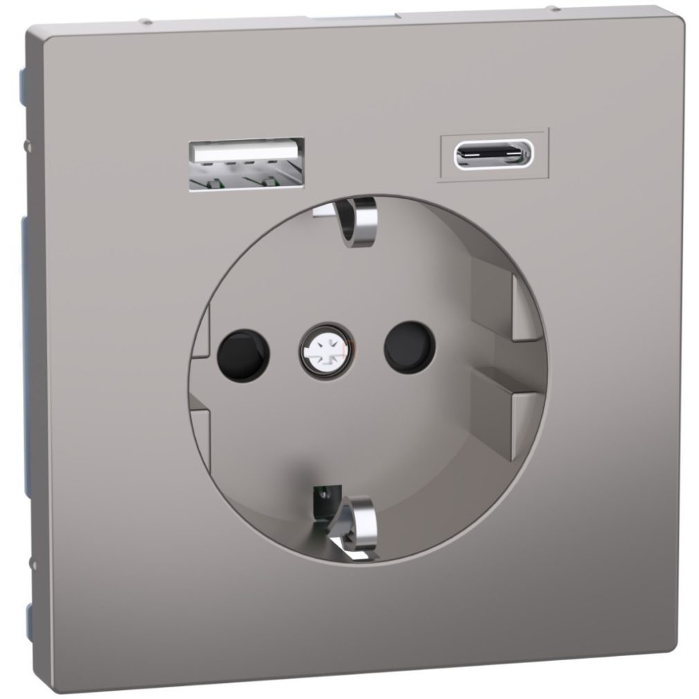 Priză MERTEN 2P+F, cu obturator de siguranță, încărcător USB A+C, cu arc, 16A / 3A, System-D, nichel MEG2367-6050 Schneider