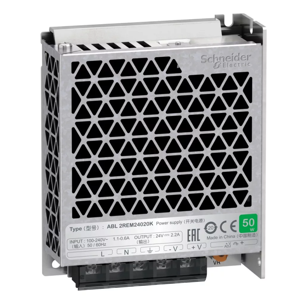 Această sursă de alimentare aparține familiei de produse Easy Modicon (cunoscută anterior sub numele de Phaseo Easy). Este o sursă de alimentare comutată reglată de 24 V c.c., model de 50 W, cu tensiune de intrare de 100 V-240 V c.a. și putere nominală de 53 W. Curentul de ieșire este de 2,2 A. Oferă performanțe mai bune la un preț avantajos. Răcirea se bazează pe convecție naturală. Are comutare automată a tensiunii. Protecția la suprasarcină este de 110-160%. Dimensiunile sale sunt 99 mm lățime x 82 mm înălțime x 30 mm adâncime. Această sursă de alimentare este echipată pentru mașini repetitive. Are certificare ABL2 ps: CE, EAC, KC, RCM, EN62368-1 (siguranță), EN 61000-6-2, EN 61000-4-2/3/4/5/6/8/11 (EMC), 55032 Clasa B, RoHS. Această sursă de alimentare are orificii de montare pentru montarea pe panou sau montarea pe suport cu 4 colțuri. Performanță mai bună la un cost mai mic. Design inteligent.